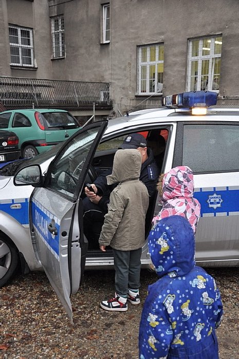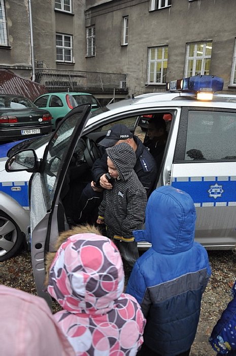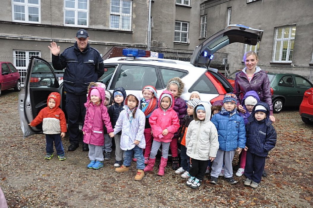 Pewnego deszczowego dnia do naszego przedszkola zawitali niezwykli goście – panowie policjanci. Wizyta ta sprawiła wszystkim wiele radości. Podczas spotkania przypomnieliśmy sobie jak należy się zachowywać na drodze oraz dlaczego tak ważne jest noszenie odblasków. Dzieci miały szansę powiedzieć kilka słów przez policyjny megafon oraz posłuchać syreny, która rozbrzmiewała specjalnie dla małych promyczków. Na koniec każda grupa miała szansę sfotografować się z panami policjantami.