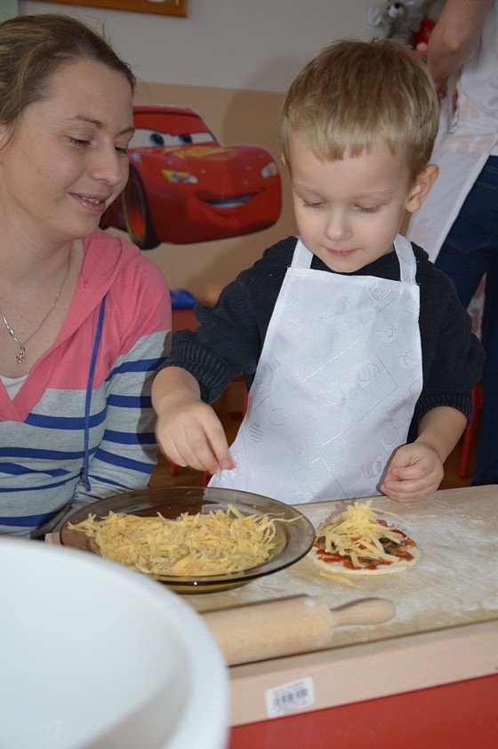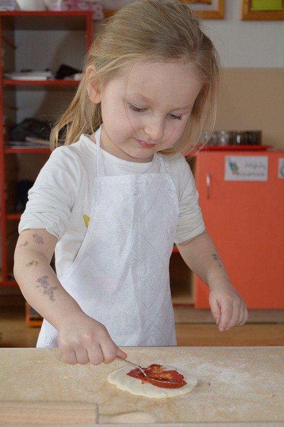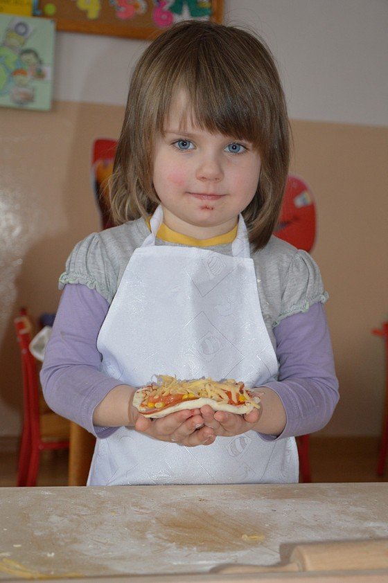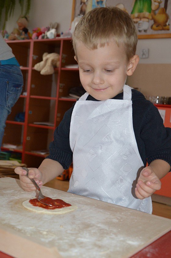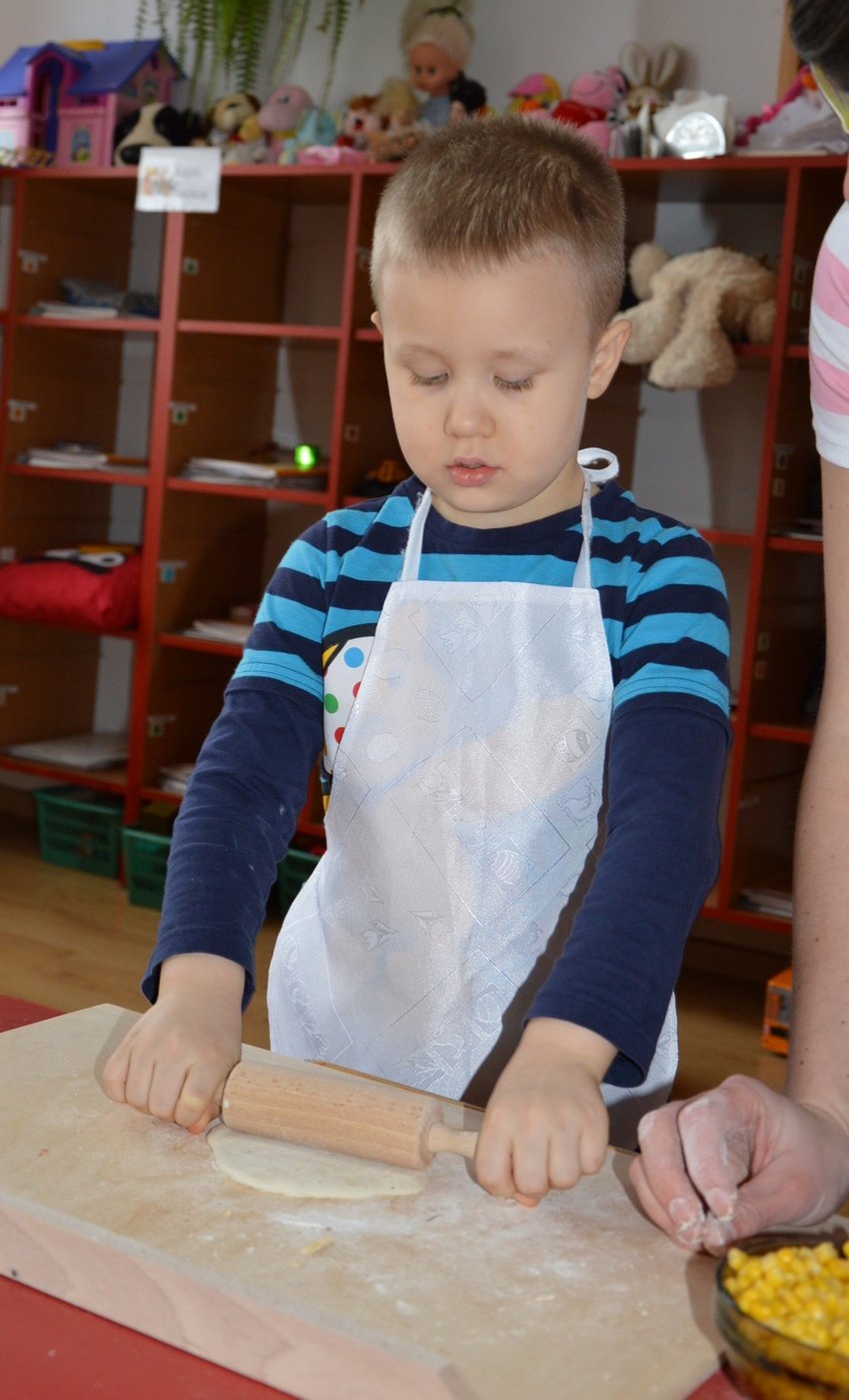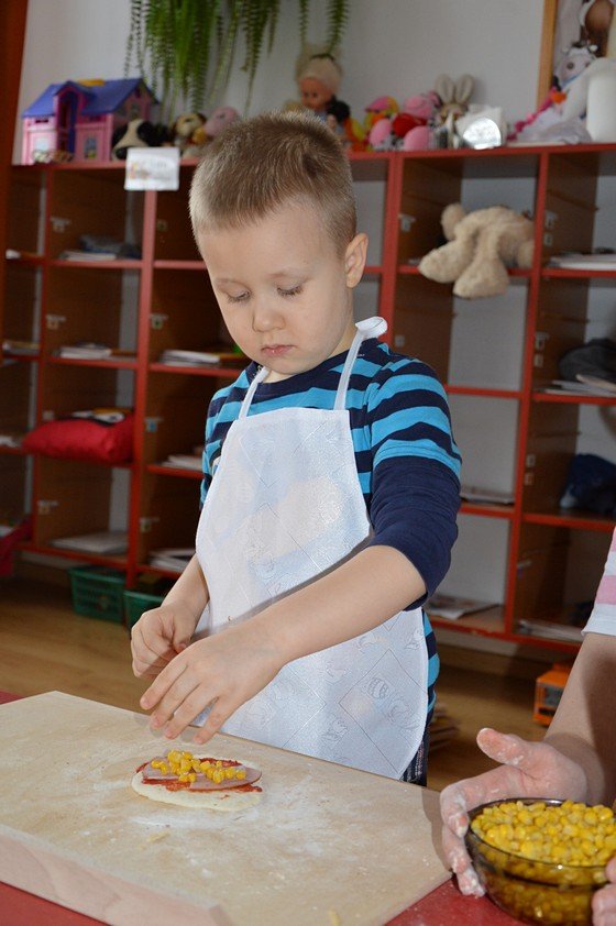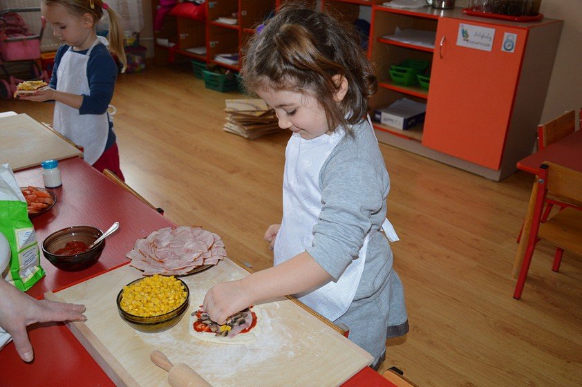 Dzieci, które przychodzą do przedszkola przed godziną 8.00 mogły zobaczyć jak pani Ula z mąki, wody i kilku innych składników tworzy kulę z ciasta. Jakie było zdziwienie wszystkich, gdy okazało się, że po godzinie ta mała kula rozrosła się na całą miskę! Przedszkolaki myślały, że wspólnie z paniami przygotują jakieś słodkie ciasto. Miłą niespodzianką był fakt, że Asy i Smyki tego dnia piekły pizzę! Pani Ania i pani Ula przygotowały wiele składników do wyboru, dlatego każdy mógł stworzyć własną i niepowtarzalną kompozycję. Uwaga! Ślinka cieknie przy oglądaniu zdjęć!