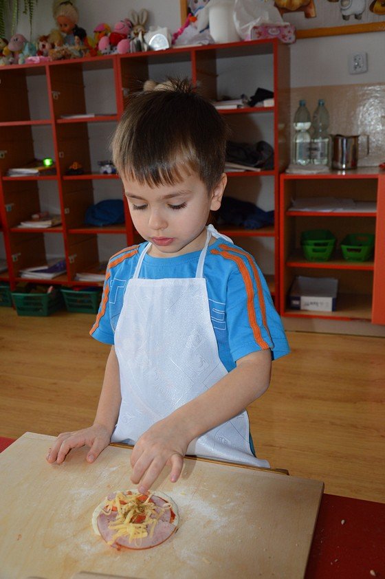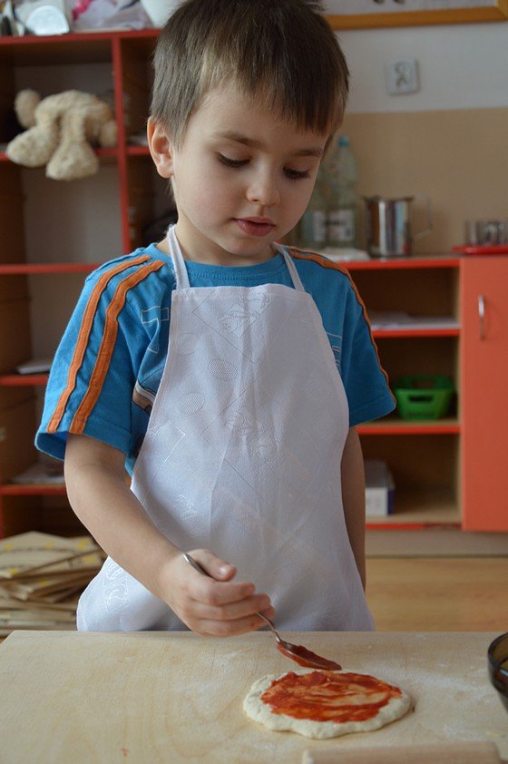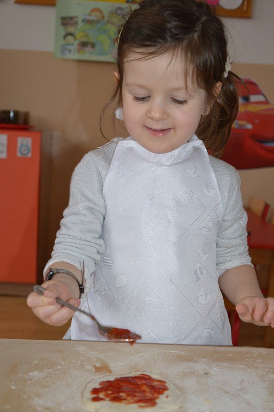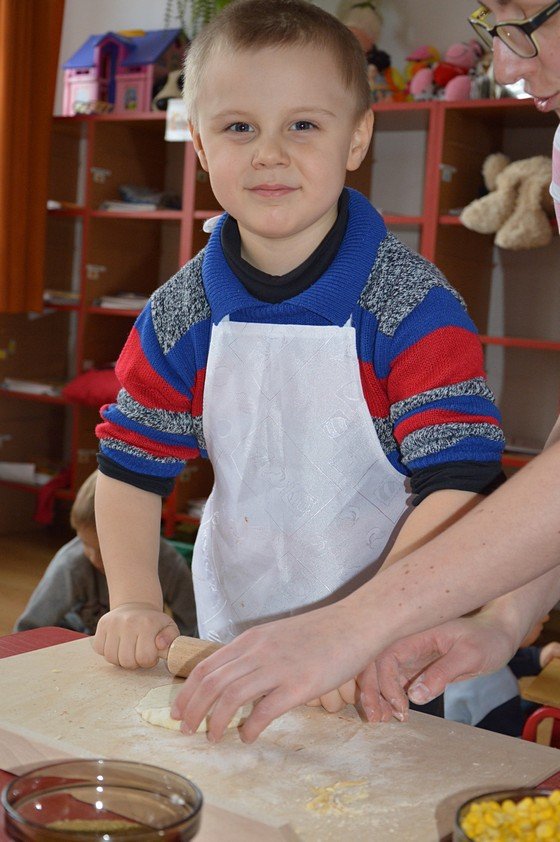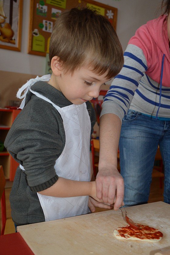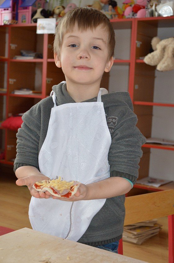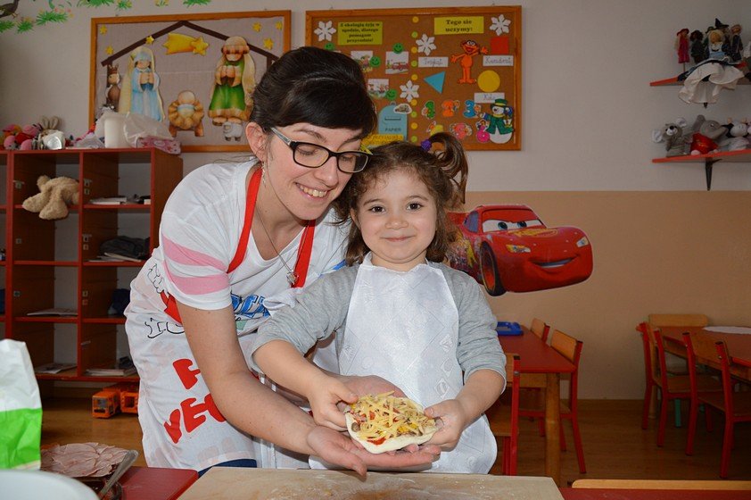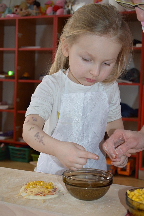 Dzieci, które przychodzą do przedszkola przed godziną 8.00 mogły zobaczyć jak pani Ula z mąki, wody i kilku innych składników tworzy kulę z ciasta. Jakie było zdziwienie wszystkich, gdy okazało się, że po godzinie ta mała kula rozrosła się na całą miskę! Przedszkolaki myślały, że wspólnie z paniami przygotują jakieś słodkie ciasto. Miłą niespodzianką był fakt, że Asy i Smyki tego dnia piekły pizzę! Pani Ania i pani Ula przygotowały wiele składników do wyboru, dlatego każdy mógł stworzyć własną i niepowtarzalną kompozycję. Uwaga! Ślinka cieknie przy oglądaniu zdjęć!