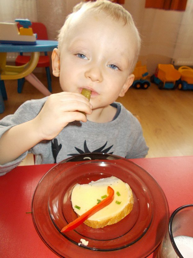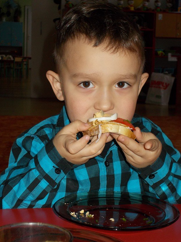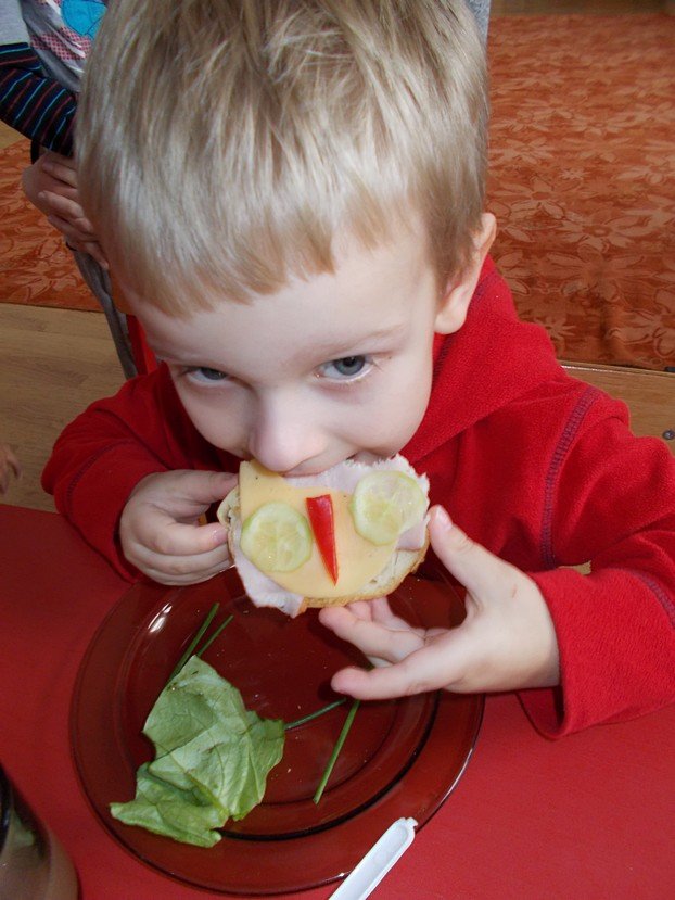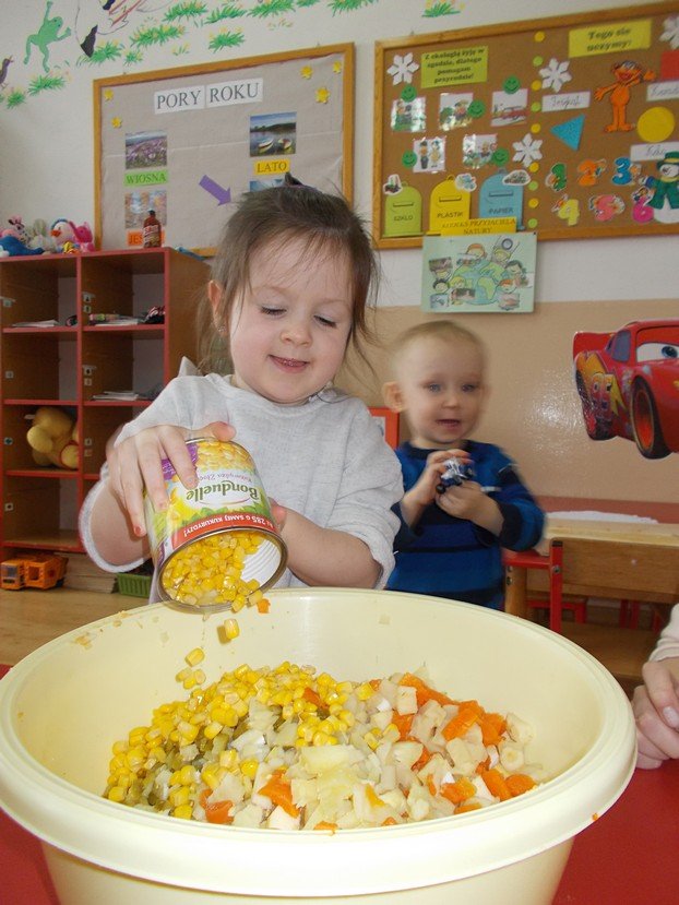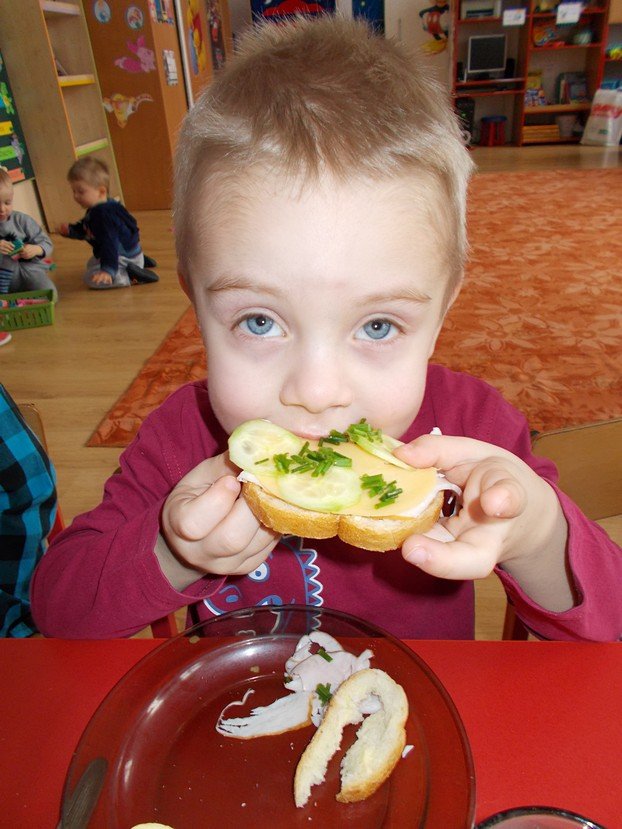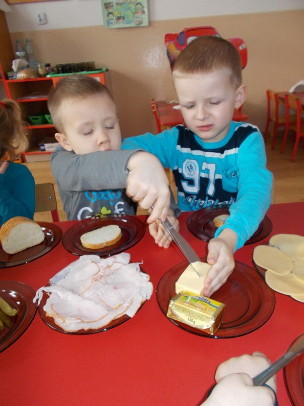 Oczywiście pani Ania i pani Paulina zadbały o to, by oprócz wiedzy teoretycznej, ich wychowankowie zdobyli również praktyczne umiejętności. Właśnie dlatego Promyczki przygotowały we środę – 4 lutego smakowite kanapki pełne witamin, natomiast w piątek 6 lutego – pyszną sałatkę jarzynową. Okazało się, że nawet największe niejadki mają smaczek na samodzielnie przygotowane specjały!
