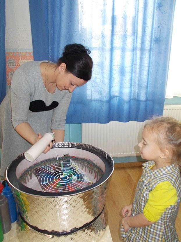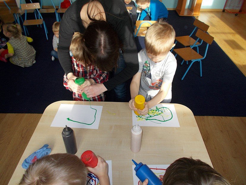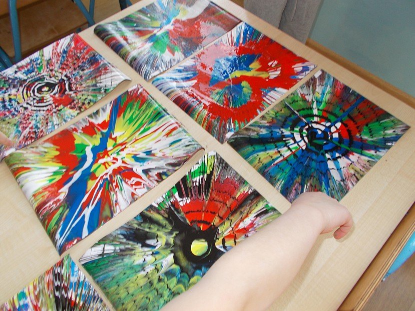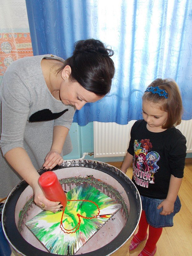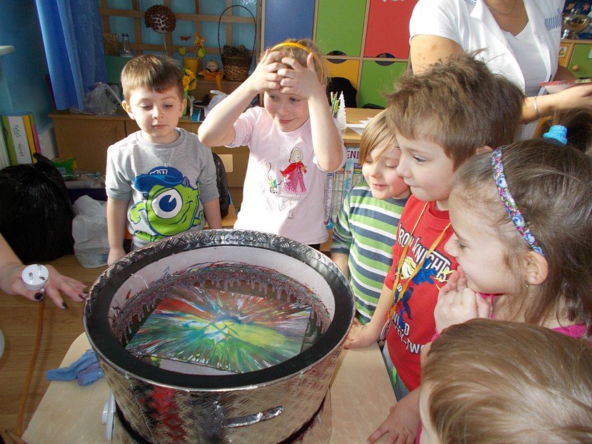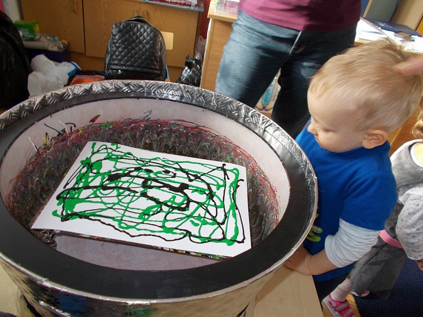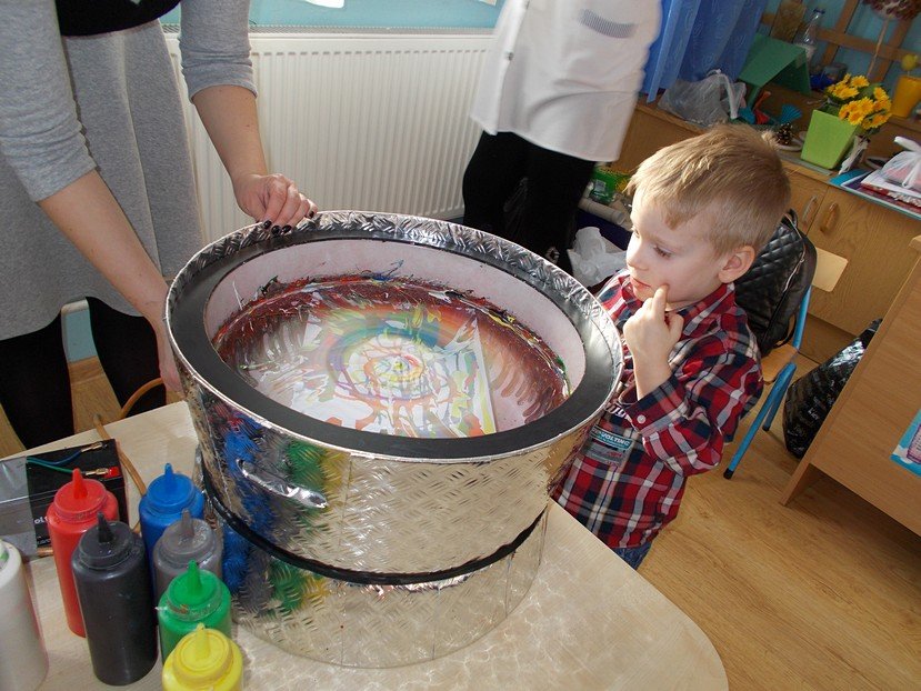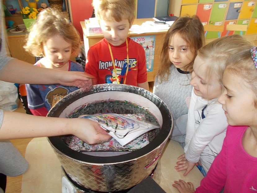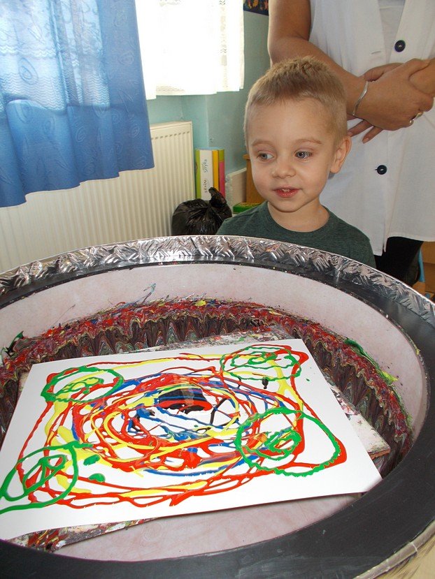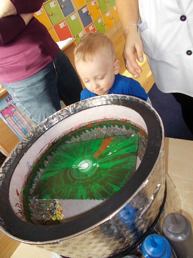 Promyczkowa kadra dba o to, aby ciągle działo się coś ciekawego i aby stale odwiedzali nas ciekawi ludzie. Tym razem dzieci miały możliwość uczestniczenia w zajęciach „Wirujące farby”.