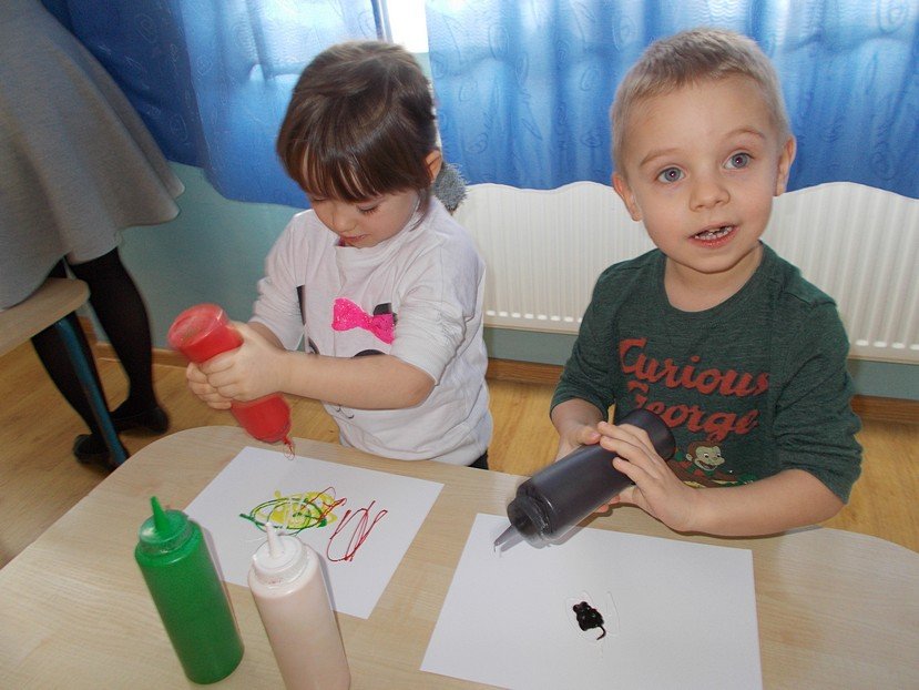 Było to niezwykle pouczające spotkanie! Promyczki wykonały piękne prace i dowiedziały się kilku ciekawych faktów na temat działania sił grawitacji i mieszania barw. Kreatywność naszych maluchów w połączeniu z niecodziennym sprzętem dała niesamowite efekty! Zapraszamy do obejrzenia galerii zdjęć.