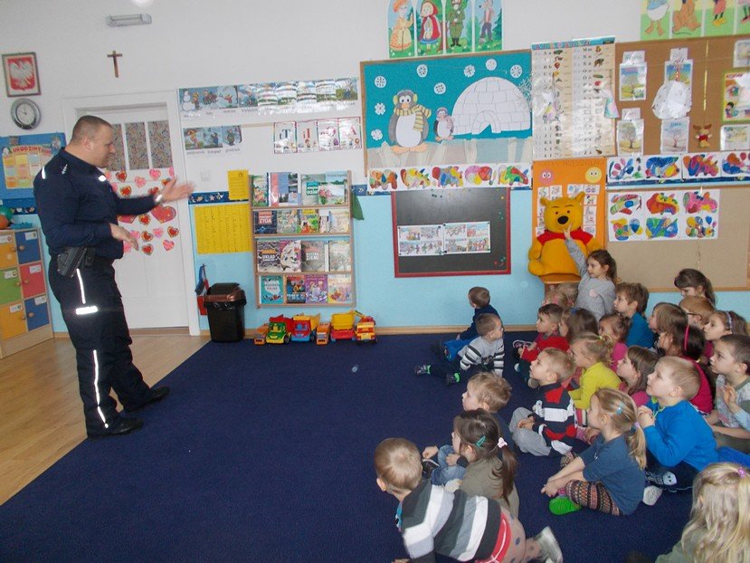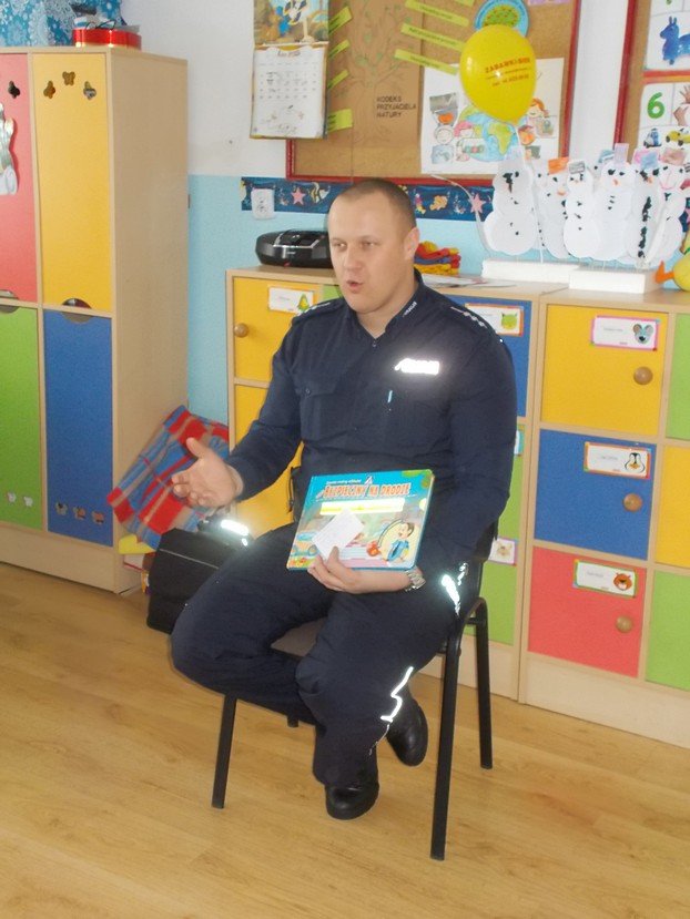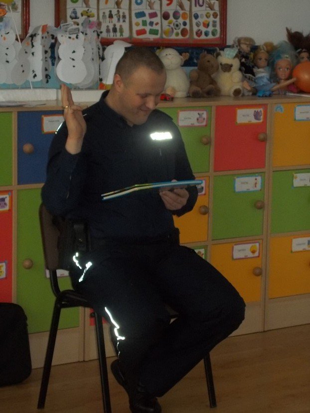 Pan dzielnicowy, w związku ze zbliżającymi się feriami, opowiedział nam nieco na temat bezpieczeństwa podczas zabaw, zwłaszcza tych zimowych, konieczności noszenia odblasków, a także o wielu innych ważnych sprawach. Na koniec spotkania asp. Nosek przeczytał nam bardzo pouczającą bajkę „Bądź bezpieczny na drodze”.
