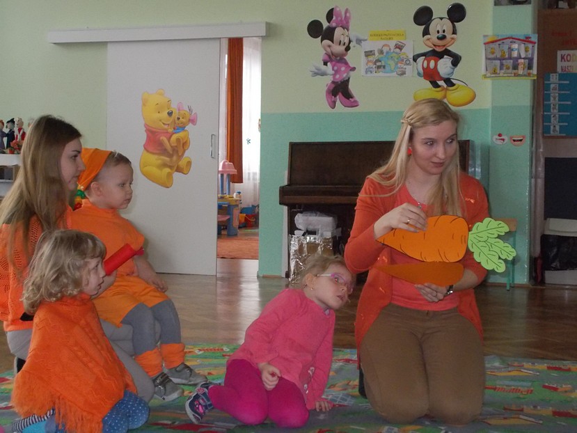 Tego dnia wszystkie Promyczki zebrały się w sali Smyków. Każdy miał na sobie coś pomarańczowego – jak przystało na wielbicieli marchewek. Pani Kinga i pani Agnieszka przygotowały dla dzieci kilka ciekawych konkurencji. Po wspólnej zabawie dzieci rozeszły się do swoich sal, gdzie czekała na nich kolejna niespodzianka …
