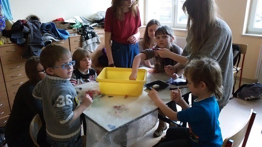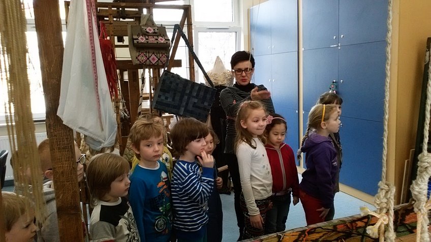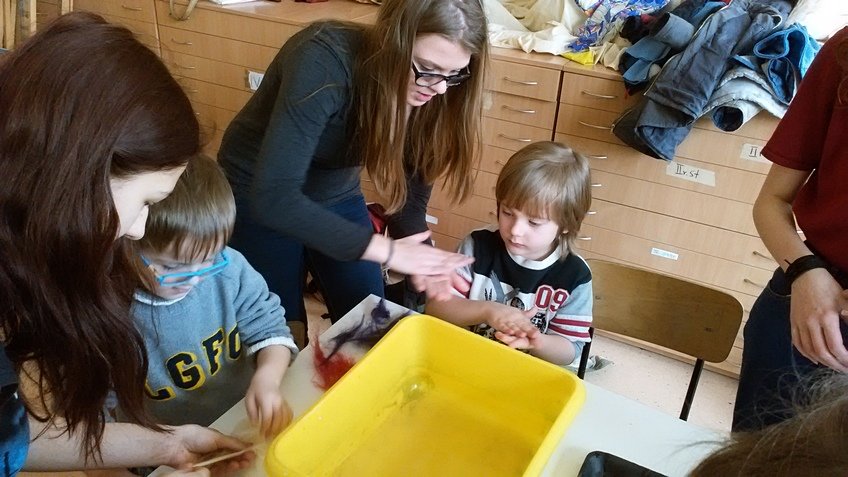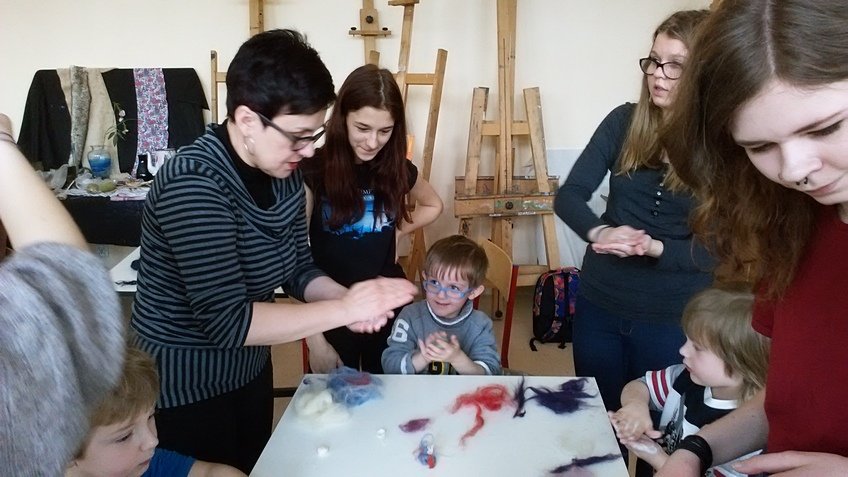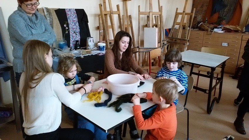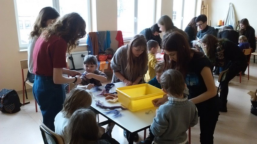 Zuchy zostały oprowadzone po szkole i wszystkich pracowniach przez Panią Aleksandrę Benn, która bardzo ciekawie opowiadała o wszystkim, co dzieci mogły zobaczyć w poszczególnych pomieszczeniach. Następnie, wspierane przez starsze koleżanki z liceum, uczestniczyły w warsztatach z filcowania z wykorzystaniem wełny czesankowej.