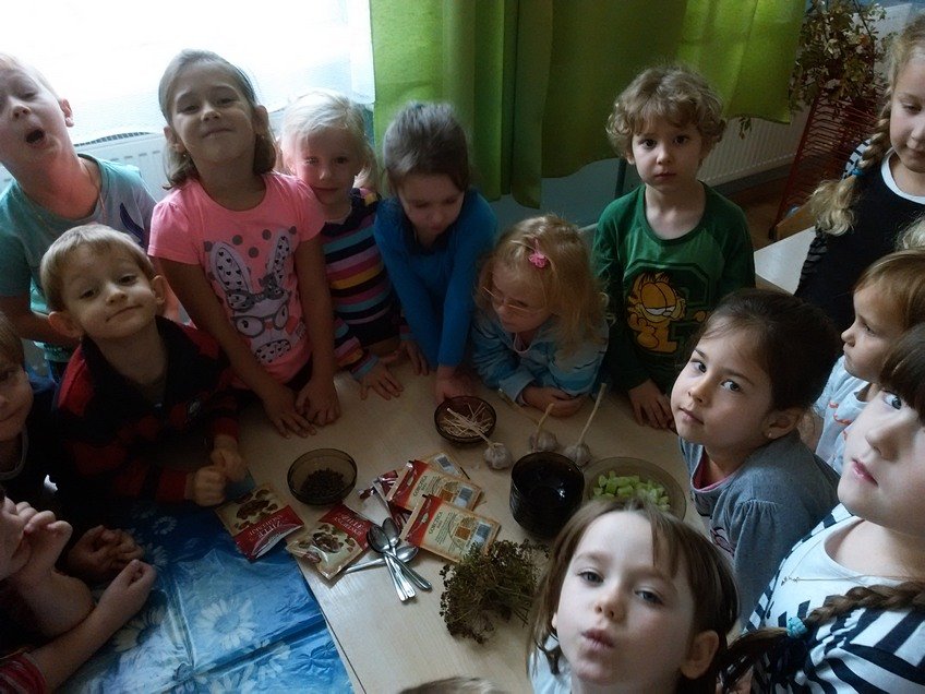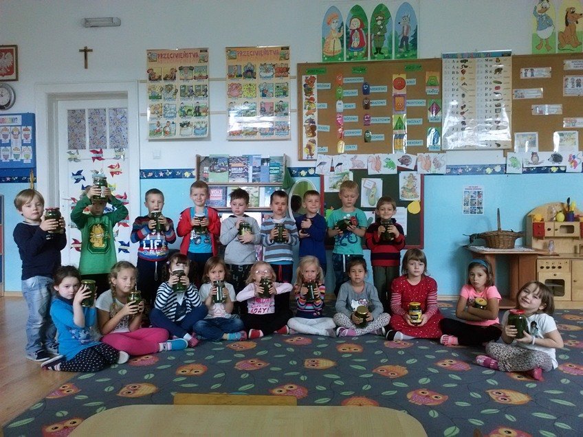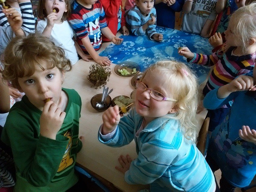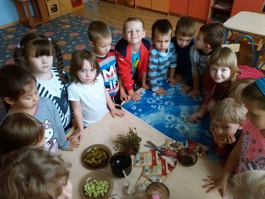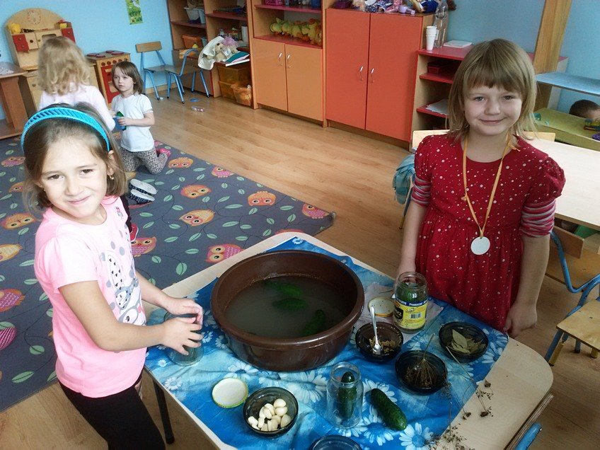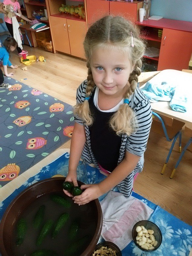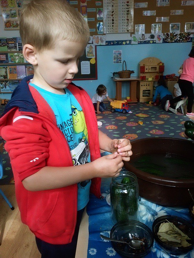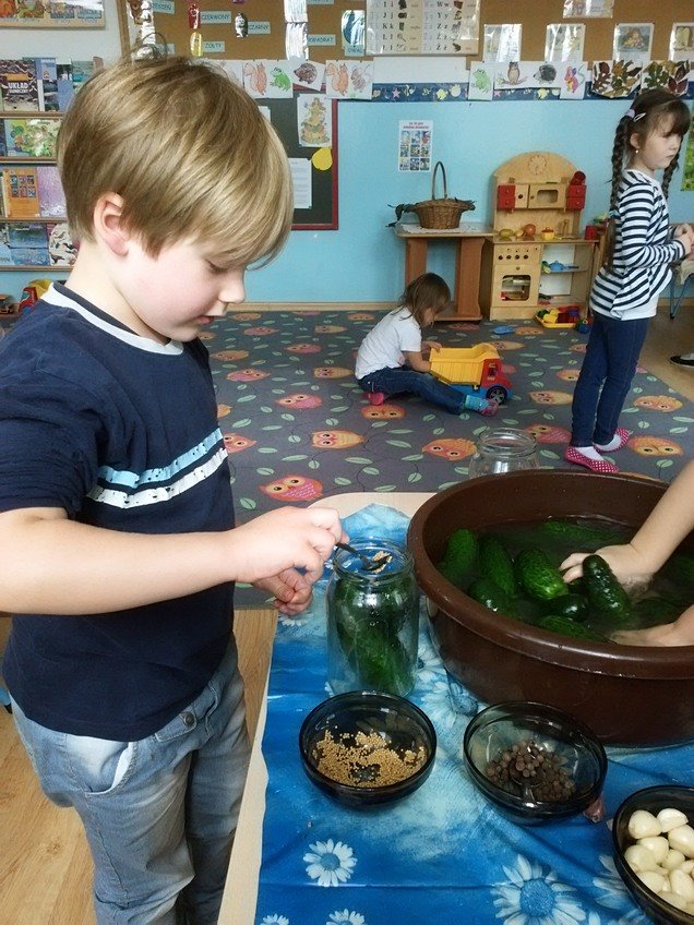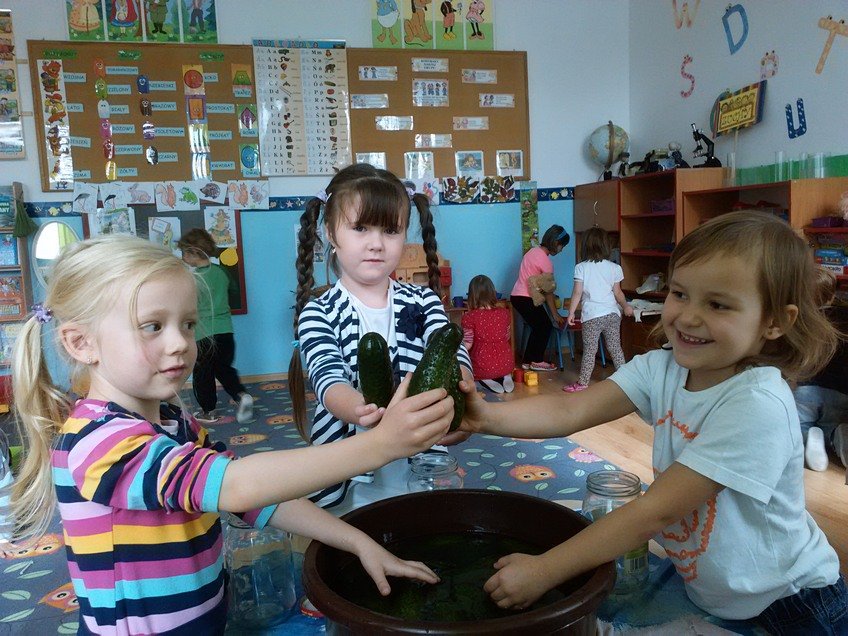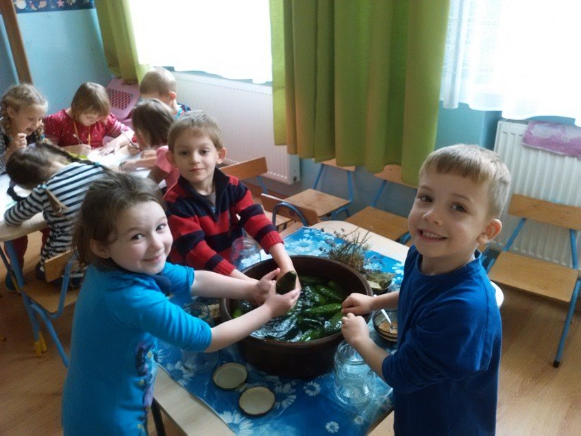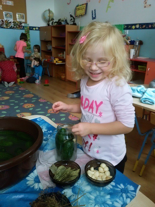 Jednak największą atrakcją było samodzielne kiszenie ogórków przez dzieci w każdej z grup. Pod okiem wychowawczyń przedszkolaki układały ogóreczki w słoikach oraz doprawiały je poznanymi wcześniej przyprawami. Z ogromnym zapałem wykonywały wszystkie instrukcje pań, a później z jeszcze większą satysfakcją wręczały swoje słoiki rodzicom.