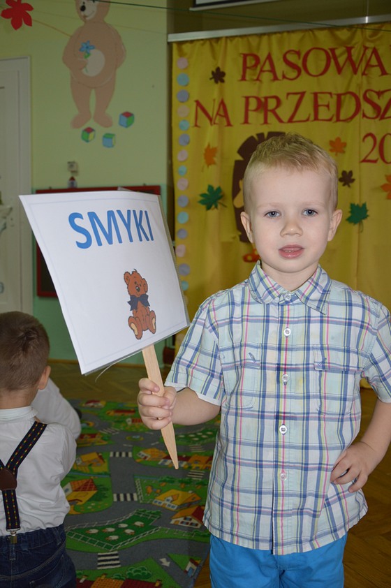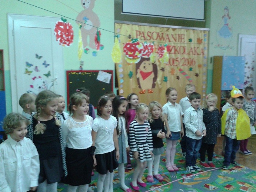 Po wspólnym ślubowaniu Pani Dyrektor pasowała na przedszkolaka dzieci z pomocą pięknego, dużego ołówka. Na zakończenie uroczystości poprosiliśmy Panią Dyrektor o oficjalne nadanie nazw grupom.