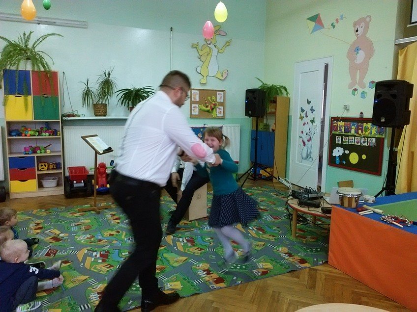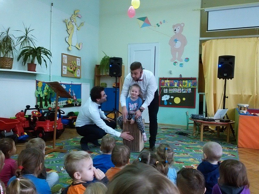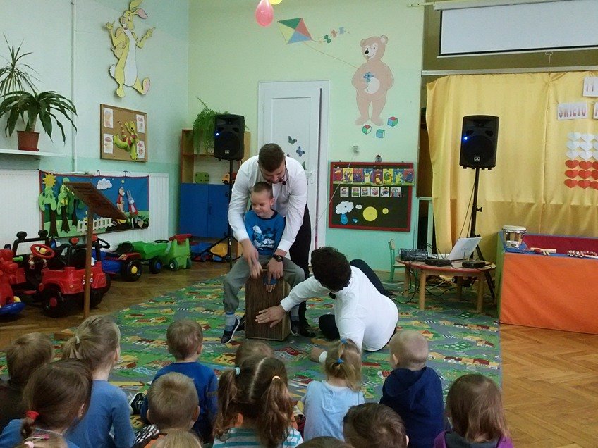 Przy okazji dały upust swojej energii i aktywnie brały udział w zajęciach. Dzieciaki tańczyły, śpiewały, klaskały, dopingowały i grały na poznanych instrumentach do woli, dlatego z niechęcią żegnały przybyłych muzyków. Jednak mamy dobre wieści - wkrótce Panowie znów nas odwiedzą.