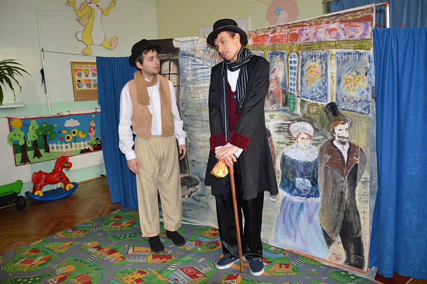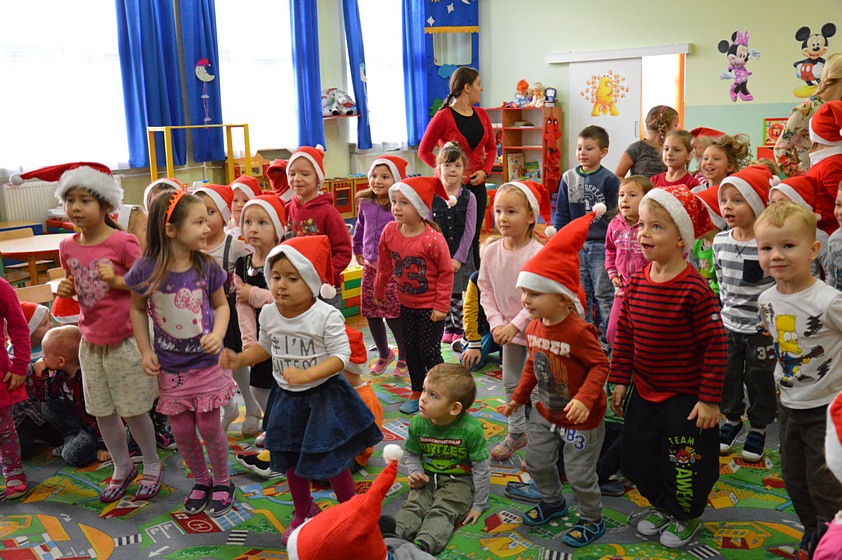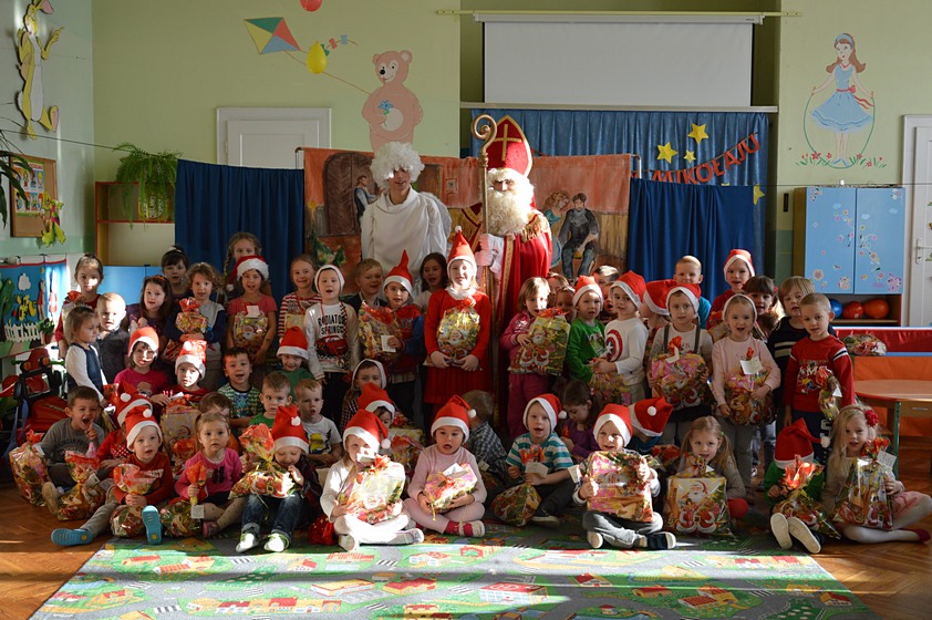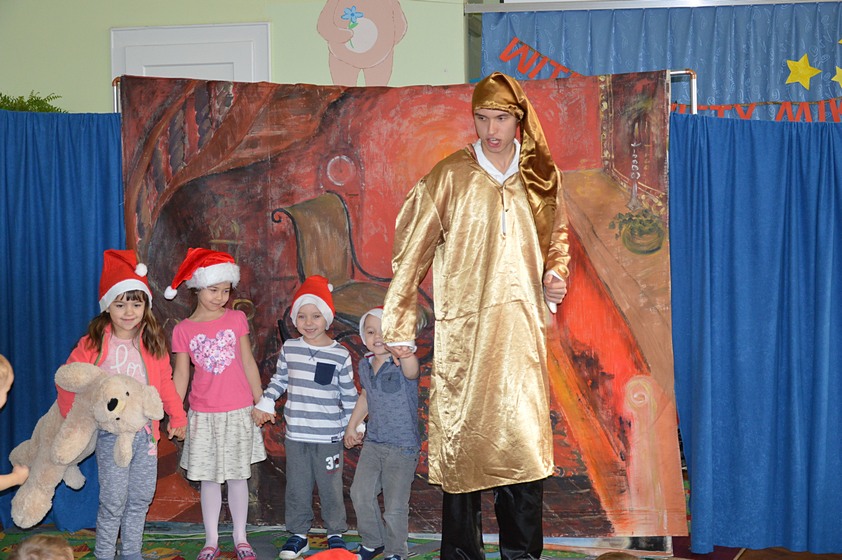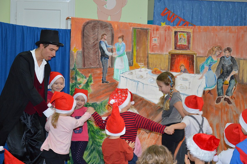7 grudnia - dzień długo oczekiwany przez wszystkie dzieci. W tym dniu do naszego przedszkola przybył Święty Mikołaj wraz ze swoim pomocnikiem aniołem. Ale zanim dzieci spotkały się z tak ważnym gościem mogły obejrzeć przedstawienie pt. "Opowieść Wigilijna", w którym główny bohater miał "serce z kamienia" a wszyscy dookoła pragnęli mu pomóc aby znów mógł cieszyć się Świętami Bożego Narodzenia tak jak wtedy, gdy był małym chłopcem. Dzieci z ogromnym zainteresowaniem oglądały występ i chętnie w nim uczestniczyły.