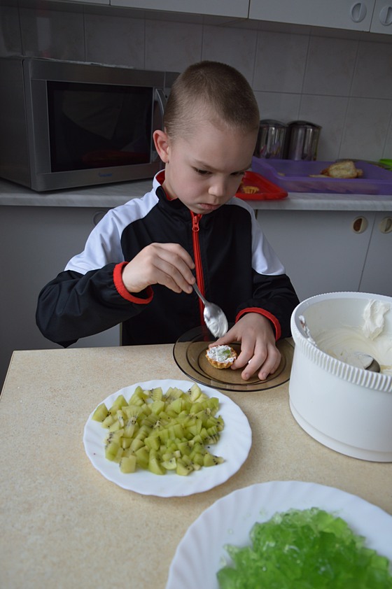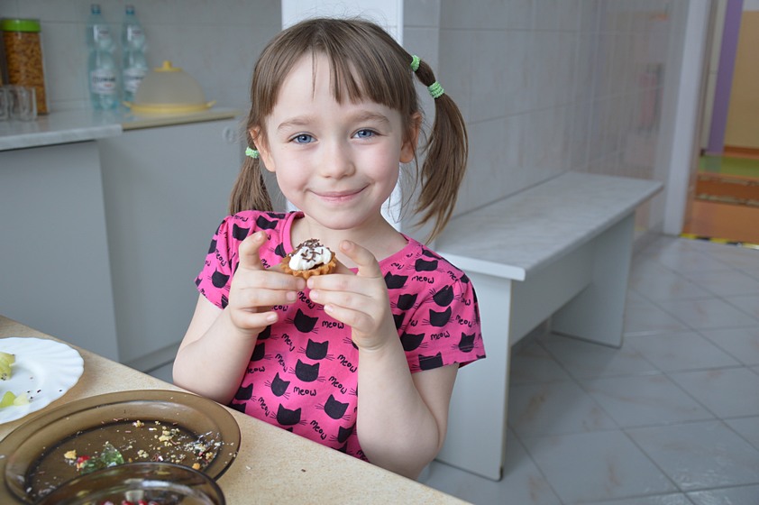 W przedszkolnej kuchni obok, dzieci w ramach kółka kulinarnego przygotowały z pomocą pani Kingi pyszne babeczki z bitą śmietaną i owocami egzotycznymi. Po obiedzie mali kucharze poczęstowali smakołykami wszystkich kolegów i koleżanki.