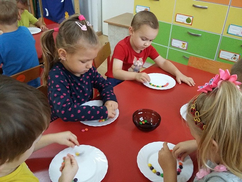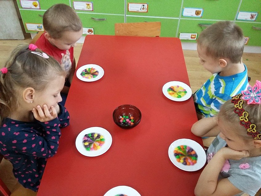 Tym razem ciekawskie Asy sprawdziły co stanie się z kolorowymi cukierkami w kontakcie z wodą. Po paru chwilach naszym oczom ukazała się tęcza! Uśmiechom nie było końca, a i troszkę cukierków udało się zjeść :)