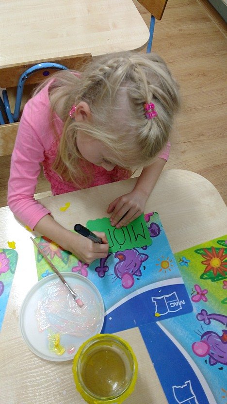 Najpierw z dużym zaangażowaniem wykonały słoik na miodek, a później z niewielką pomocą pani Uli, stworzyły życzenia dla Misia, które został y umieszczone na pięknej kartce urodzinowej. Warto dodać, że już prawie każdy Zuch potrafi podpisać się sam!