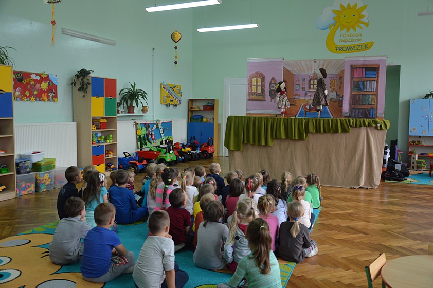 W ostatnim czasie nasze przedszkole odwiedził teatr lalek Bajka z przedstawieniem "Magiczne słowo". Była to opowieść o dziewczynce o imieniu Lena, która była bardzo kapryśna i nie słuchała swojej mamy. Jak potoczyły się jej losy? Tego należy zapytać naszych Promyczków, które z niezwykłym zainteresowaniem oglądały przedstawienie.