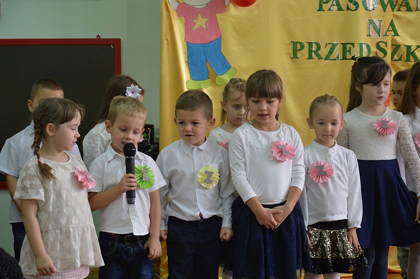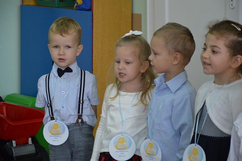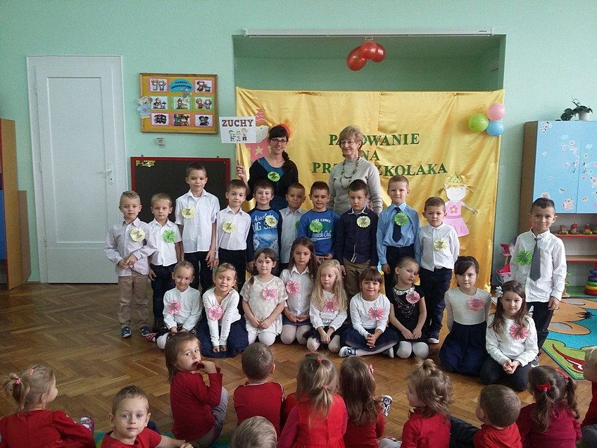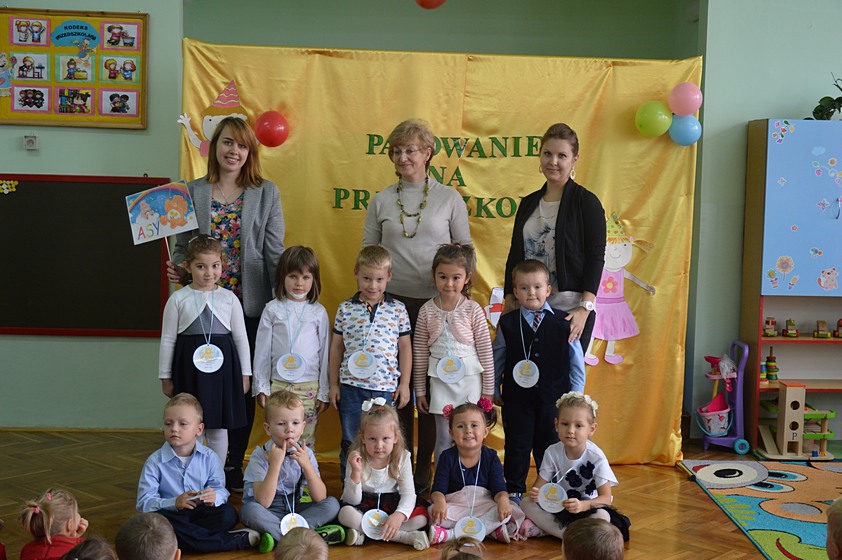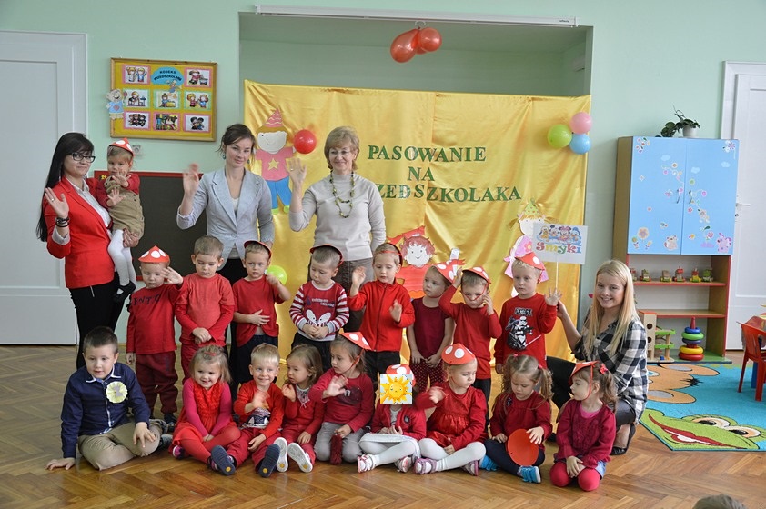 19 października w naszym Przedszkolu odbyła się wielka uroczystość - Pasowanie na Przedszkolaka! O godzinie 10.00 wszystkie grupy zebrały się w pięknie udekorowanej sali Smyków. Prowadząca - pani Ula - powitała dzieci i opowiedziała kilka słów o całej imprezie. Potem głos zabrała pani Dyrektor - Renata Sokołowska.