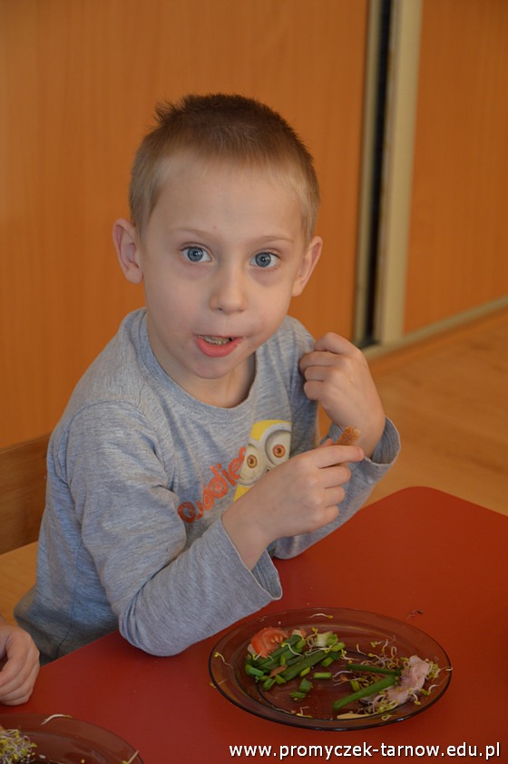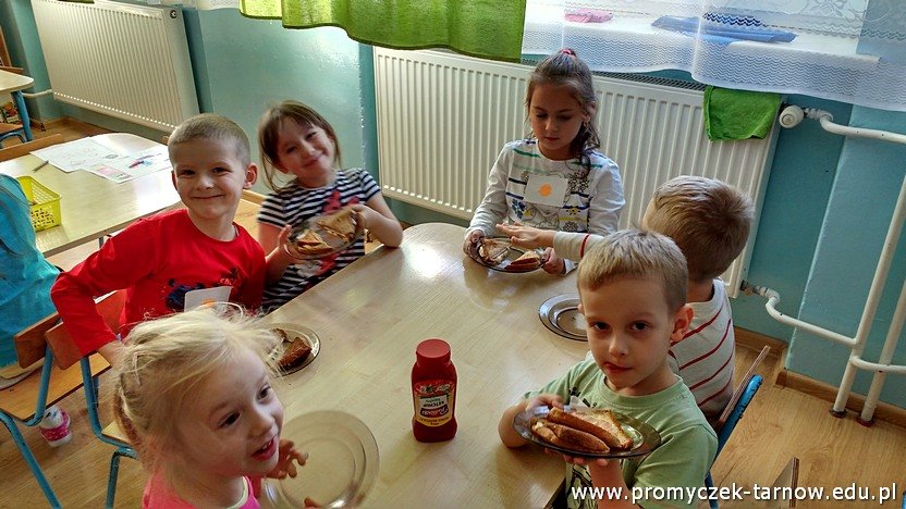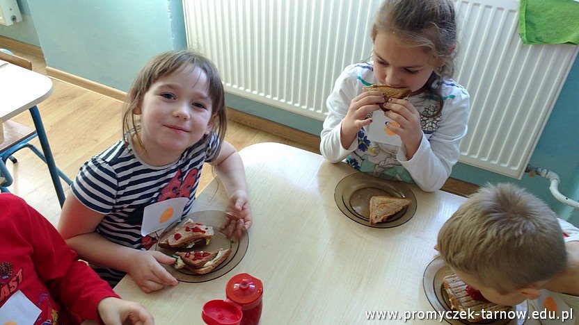 Dzieci w obydwu grupach ochoczo zabrały się do przygotowywania posiłków. Asy przygotowywały zdrowe kanapki, a Zuchy tosty na ciepło. Na pełnoziarnistym chlebku znalazła się wędlina, ser żółty, szczypiorek, pomidor i inne smakołyki. Mmm.. aż ślinka cieknie!