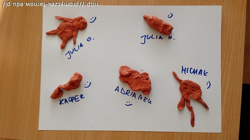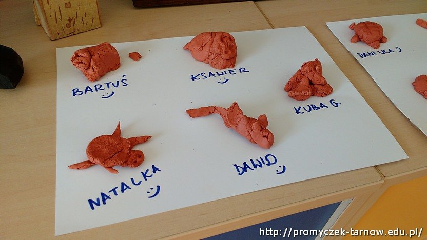 Na początek dzieci oglądały rzeźby przyniesione przez panią Ulę - były to dzieła wykonane z drewna. Następnie przyszedł tworzyły rzeźby z samych siebie i swoich kolegów. Na koniec czas na poznanie właściwości gliny i zabawę w rzeźbiarzy - tworzenie zwierząt udomowionych i dzikich z dostępnej masy. Promyczki uznały, że praca z gliną wcale nie jest prosta i każdy rzeźbiarz musi się natrudzić, aby osiągnąć zadowalający efekt.