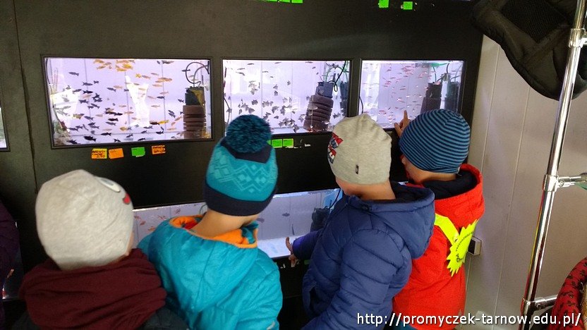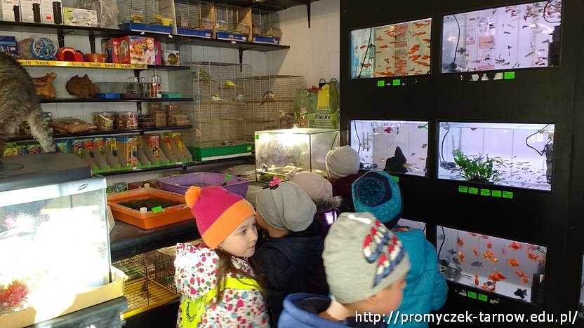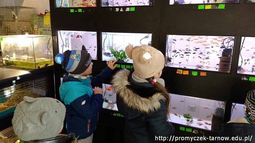 Kiedy prace były gotowe przedszkolaki udały się na spacer, w bardzo konkretnym celu. Pani Ula przygotowała małą niespodziankę - zabrała Zuchy do sklepu zoologicznego, aby kupić rybki do naszego akwarium. Dzieci same wybrały rybki, które zamieszkają w naszym przedszkolu. Nie obyło się bez małej batalii, gdyż wychowawczyni nie chciała zgodzić się na zakup trzciniaka, czyli węża wodnego ;)