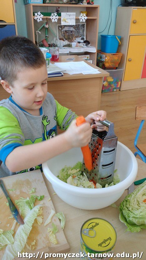 Jedną z piosenek, jaką często można usłyszeć w naszym przedszkolu jest utwór "Witaminki, witaminki" Fasolek. Nasze dzieci wiedzą, że należy jeść warzywa i owoce, ale kiedy przyjdzie czas obiadu niechętnie sięgają po surówki. Pani Ula postanowiła zachęcić dzieci do spożywania tych bomb witaminowych i wspólnie z dziećmi przygotować surówkę.