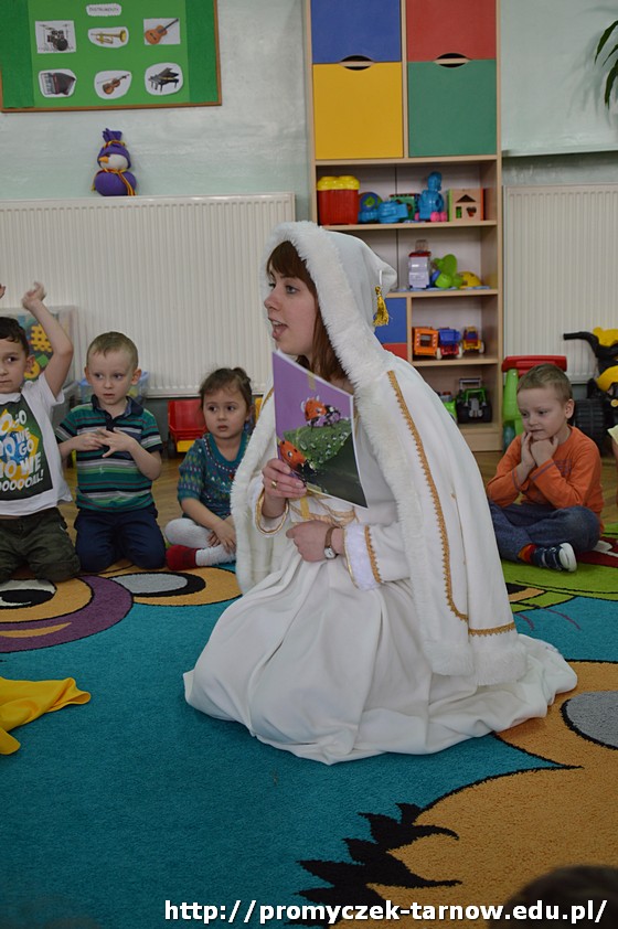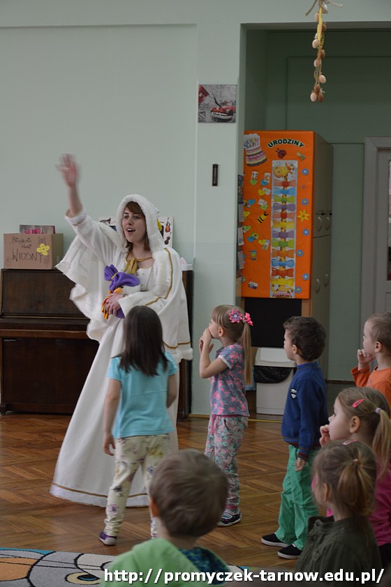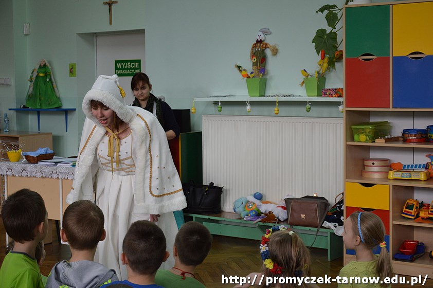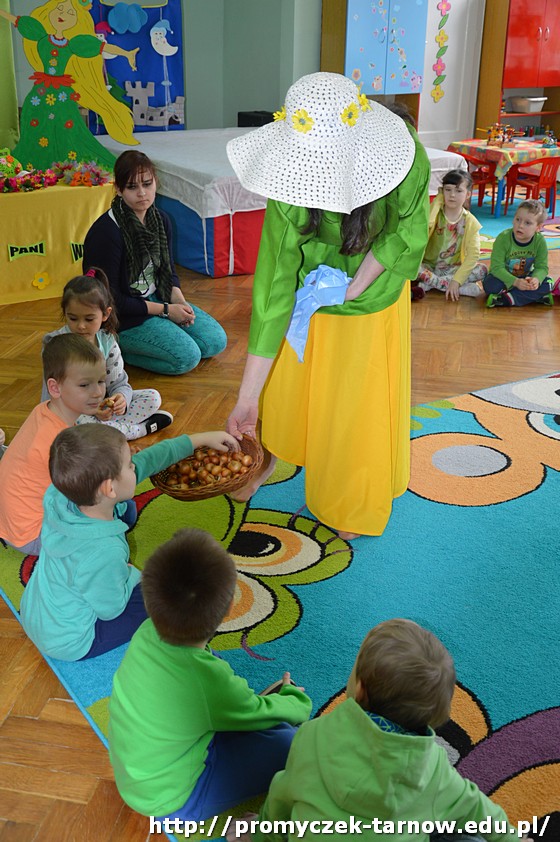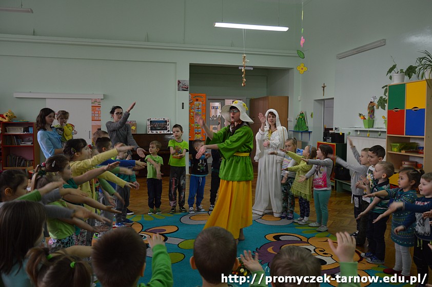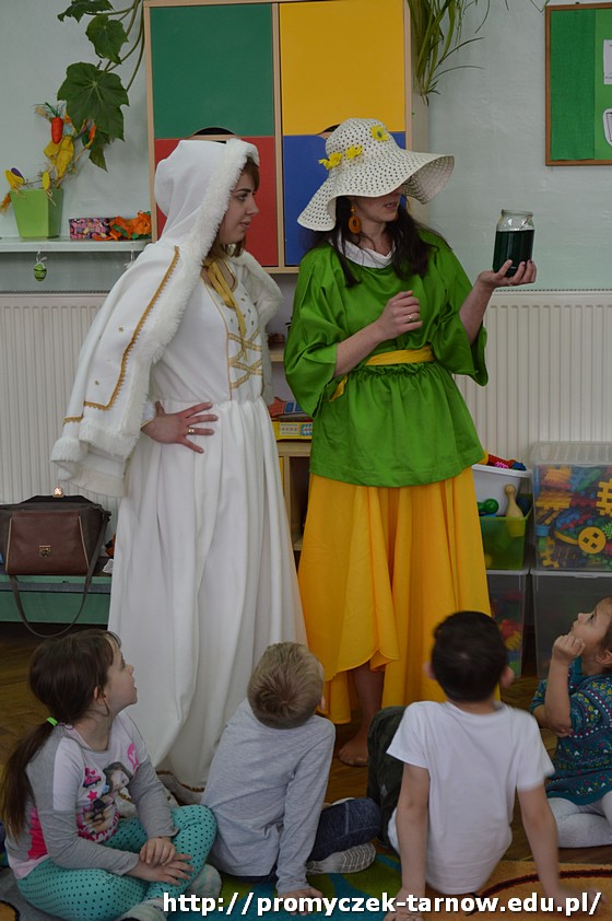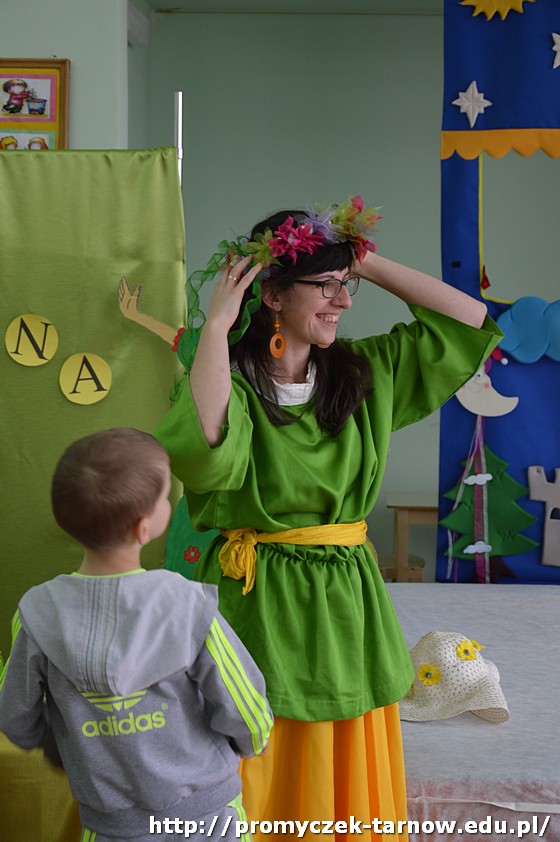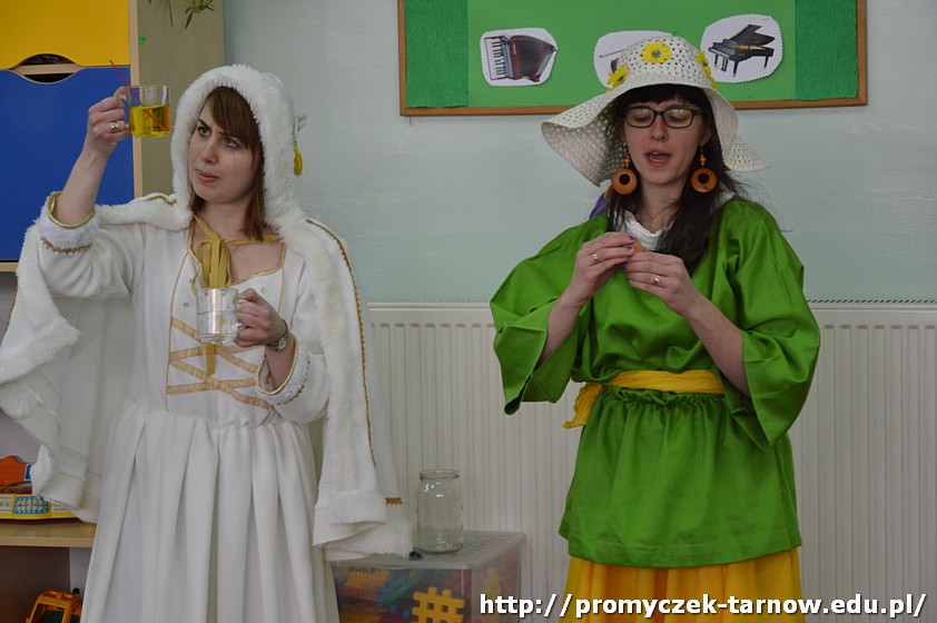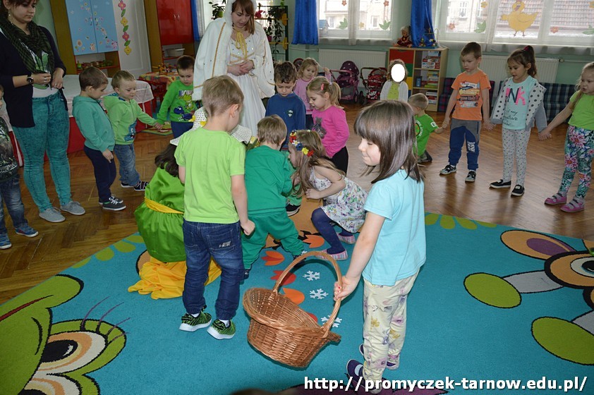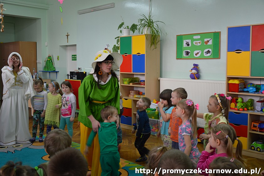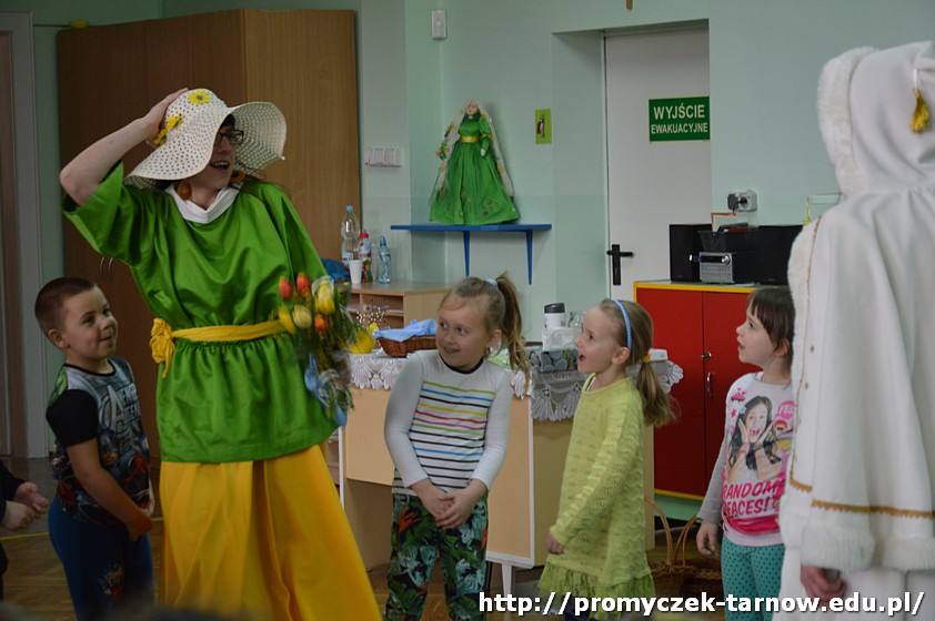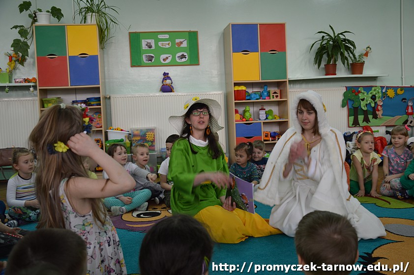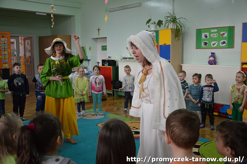 Następnie przedszkolaki uczestniczyły w uroczystości powitania Wiosny, podczas którego dwie siostry - Wiosna i Zima, spierały się o to, która z nich ma objąć panowanie nad przyrodą. W związku z tym dzieci mogły wziąć udział w zabawach i konkursach, które ostatecznie doprowadziły do zwycięstwa Pani Wiosny.