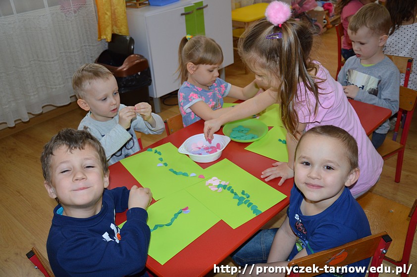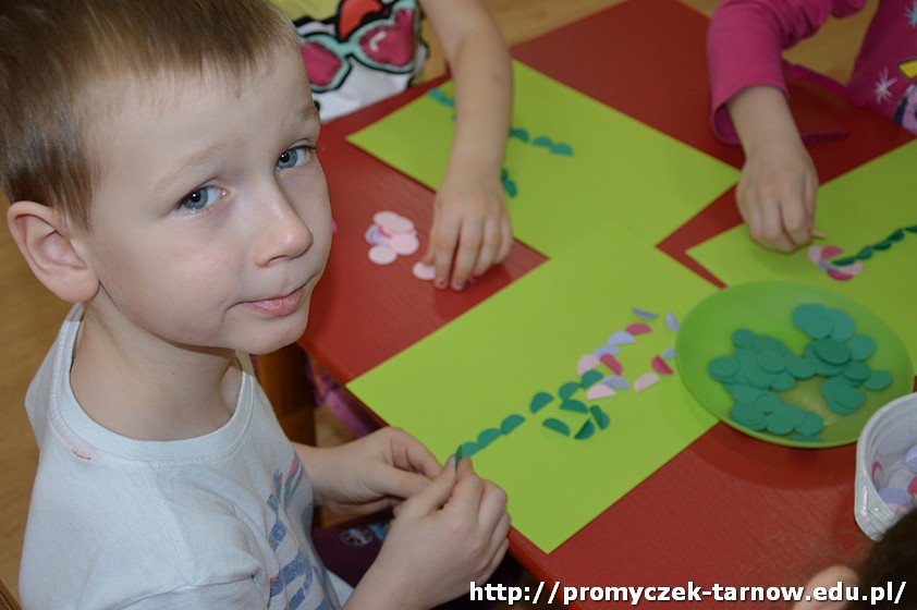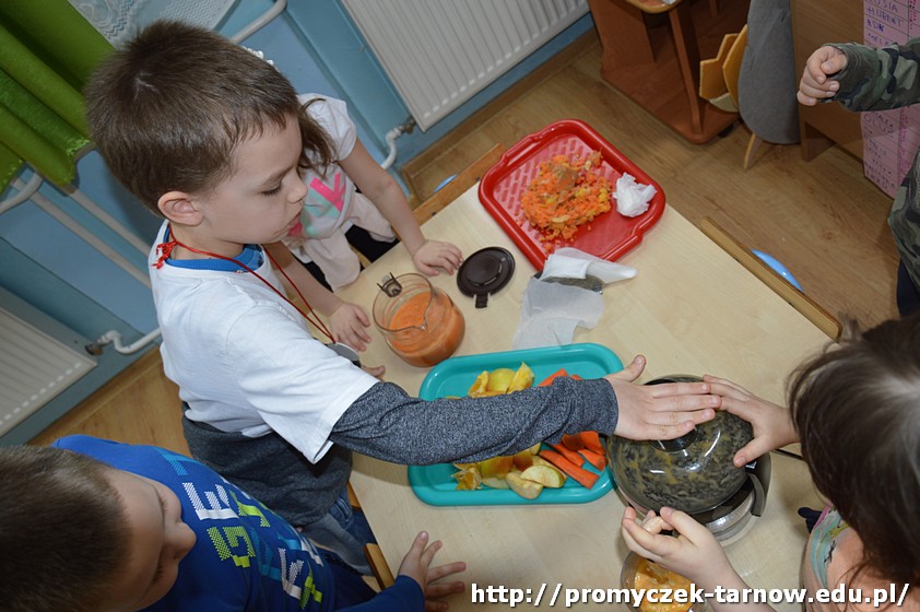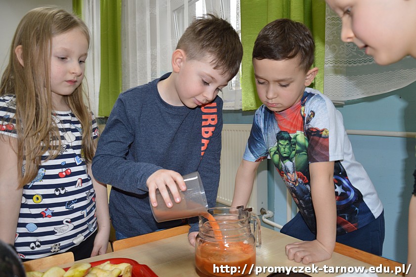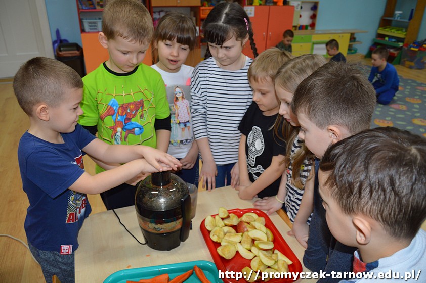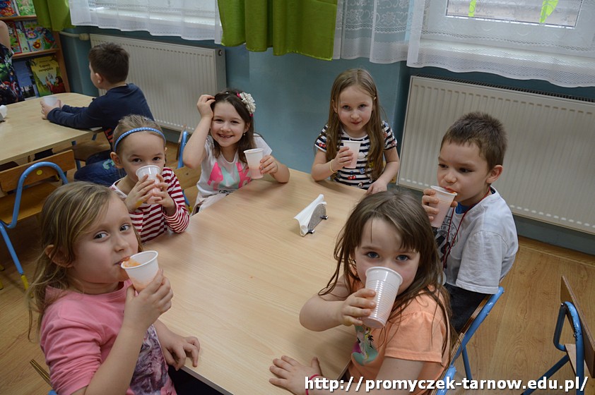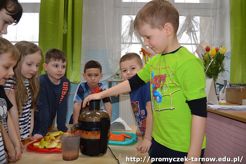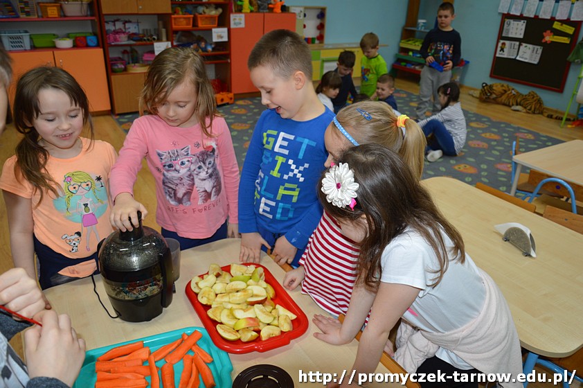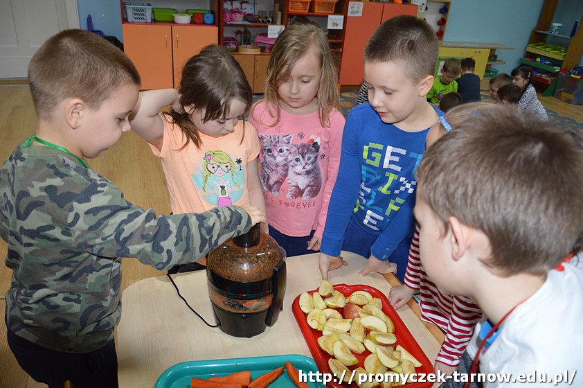 Po zakończeniu zabaw dzieci przeszły do sal, gdzie czekały na nich zajęcia kulinarne, plastyczne oraz rytmiczno - ruchowe. Przedszkolaki bardzo chętnie wzięły w nich udział, a efekty prac to odpowiednio : smakowity i zdrowy sok oraz pomysłowe kwiaty z origami na kole.