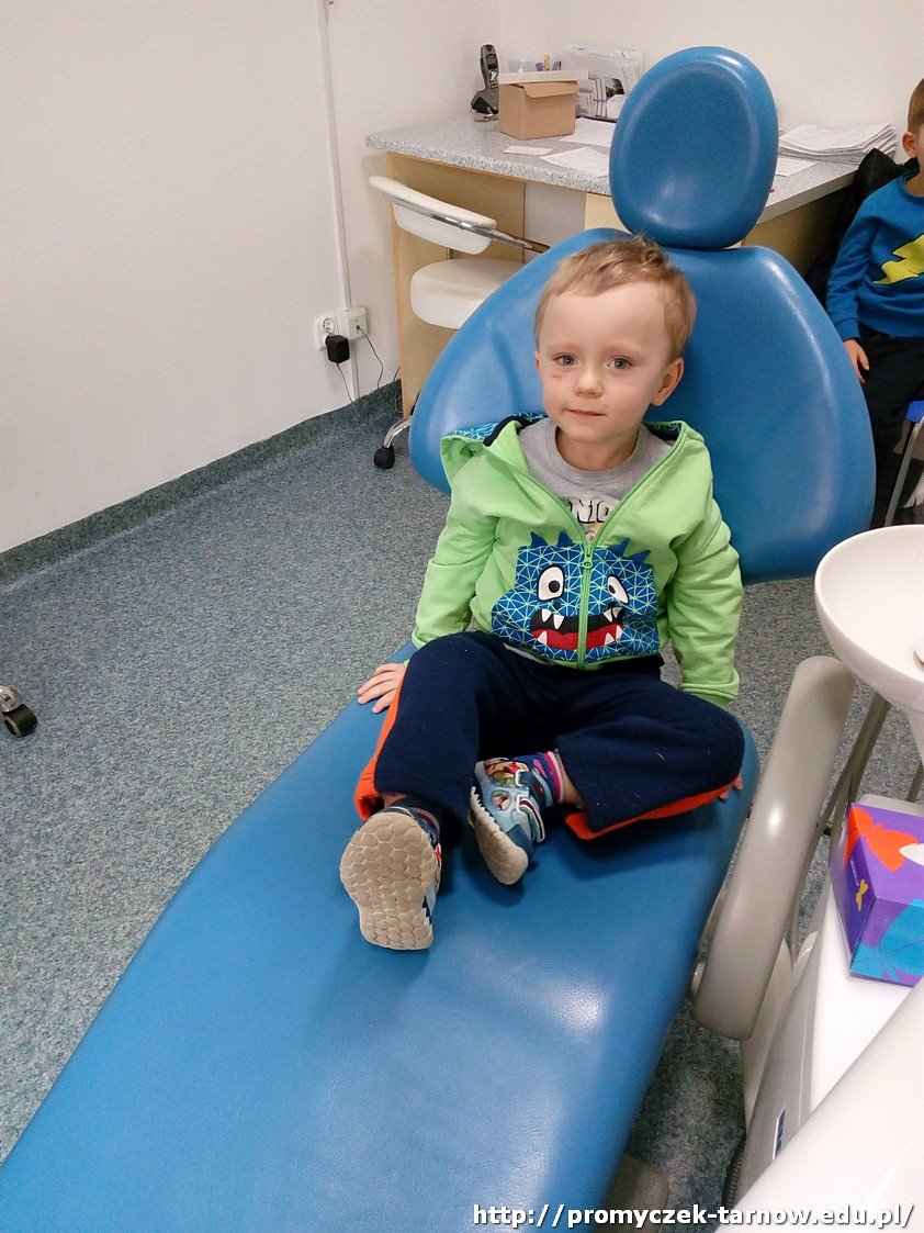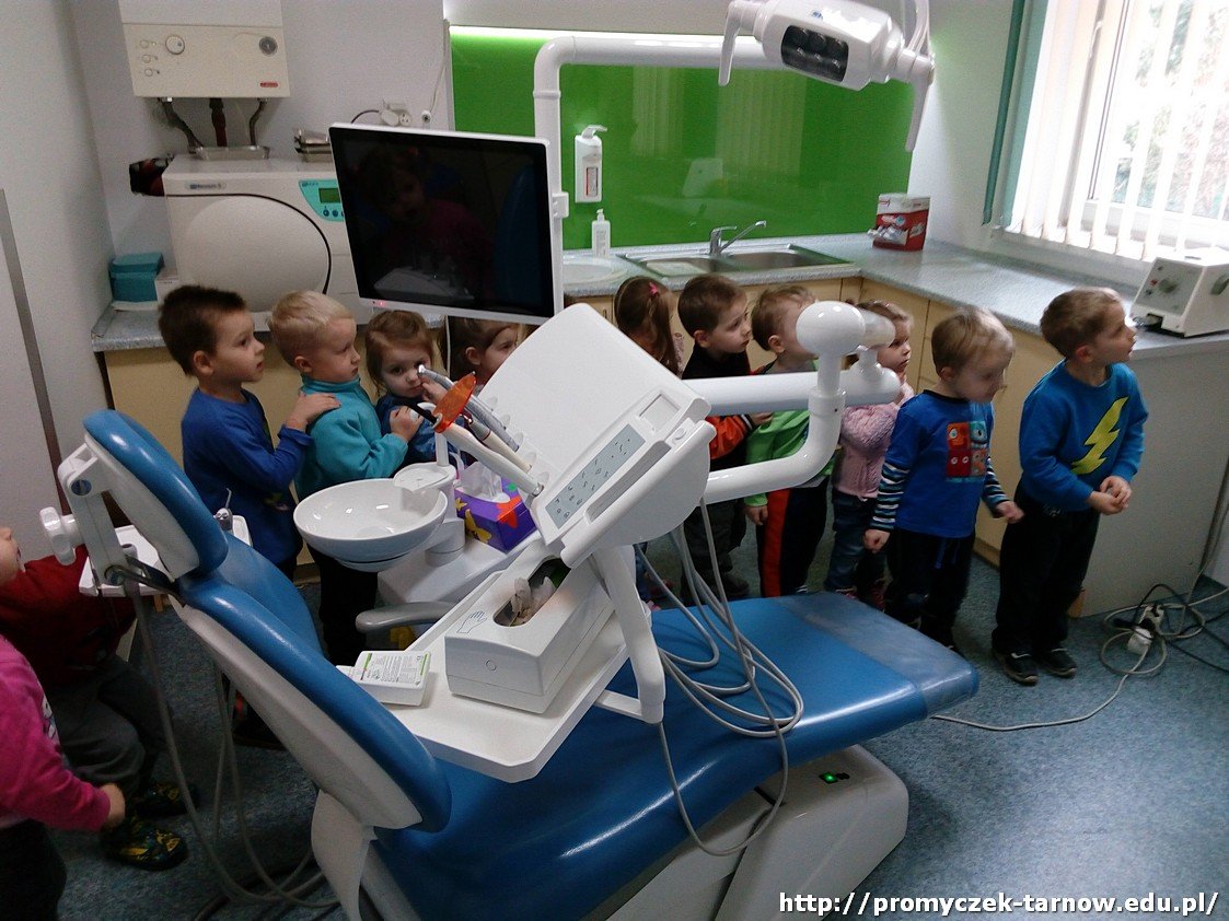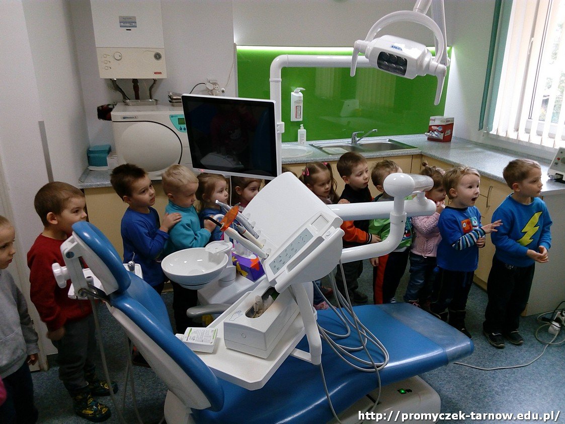 Niedaleko naszego przedszkola znajduje się gabinet stomatologiczny, do którego wspólnie się wybraliśmy. Odwiedziliśmy Panią stomatolog, która pokazała nam piramidę żywienia i doradziła jakie produkty powinniśmy spożywać, aby mieć zdrowe ząbki. Mogliśmy się przyjrzeć z bliska jak wygląda jej gabinet oraz narzędzia, którymi posługuje się na co dzień, by leczyć pacjentów. Na koniec każdy z nas otrzymał dyplom.