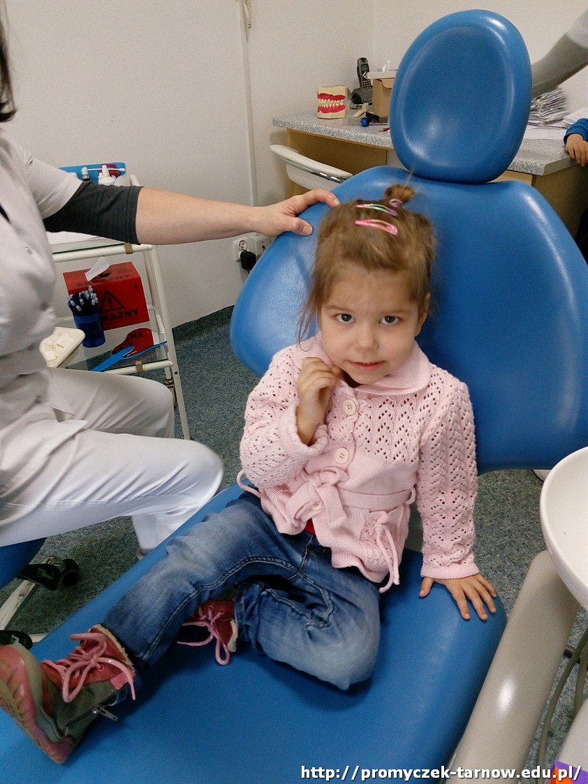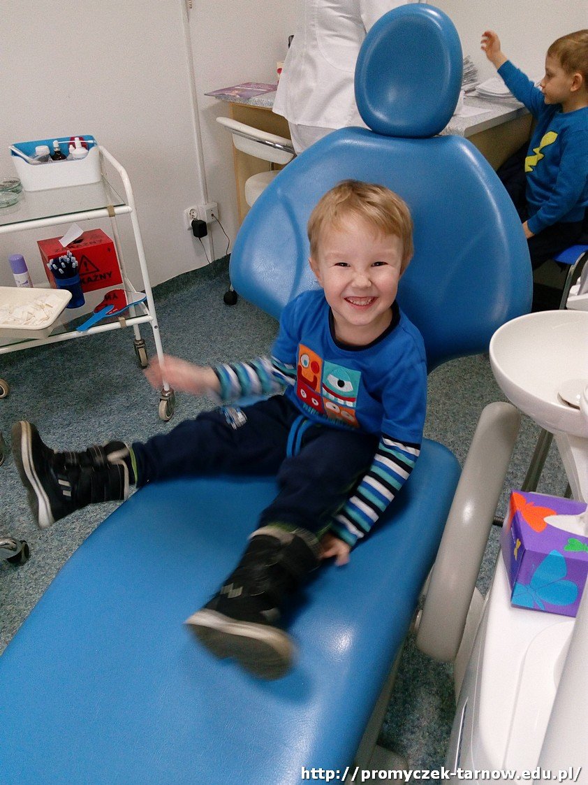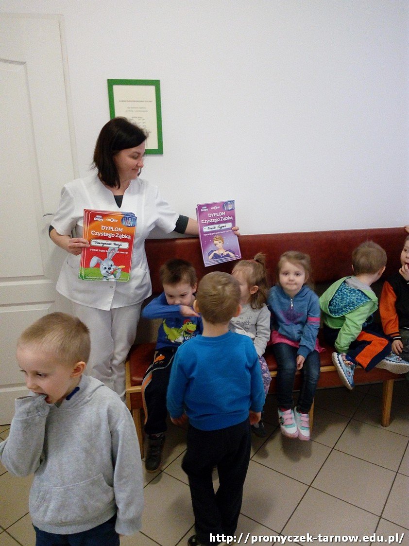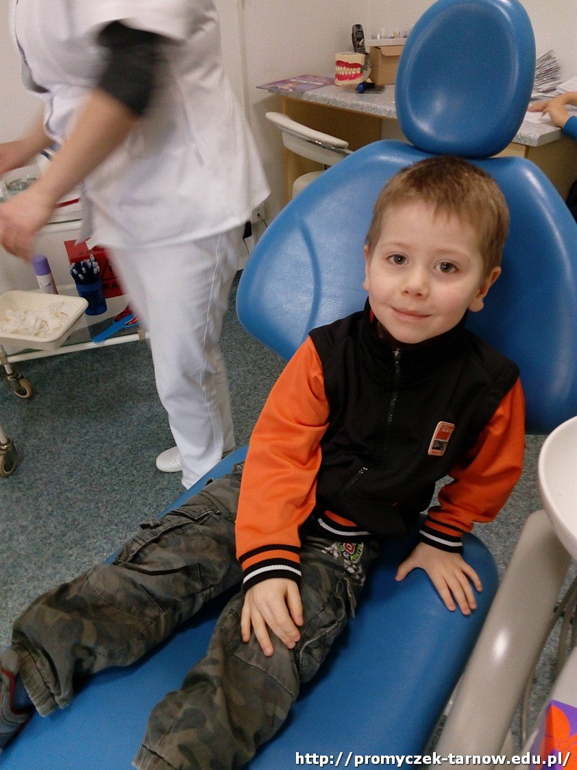 Niedaleko naszego przedszkola znajduje się gabinet stomatologiczny, do którego wspólnie się wybraliśmy. Odwiedziliśmy Panią stomatolog, która pokazała nam piramidę żywienia i doradziła jakie produkty powinniśmy spożywać, aby mieć zdrowe ząbki. Mogliśmy się przyjrzeć z bliska jak wygląda jej gabinet oraz narzędzia, którymi posługuje się na co dzień, by leczyć pacjentów. Na koniec każdy z nas otrzymał dyplom.