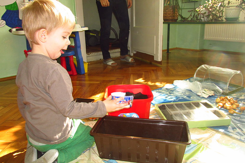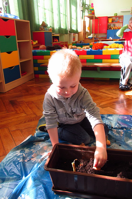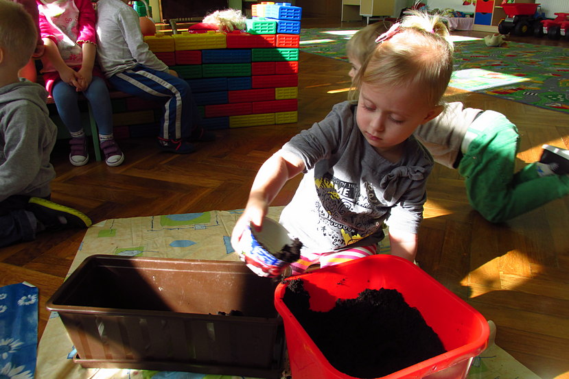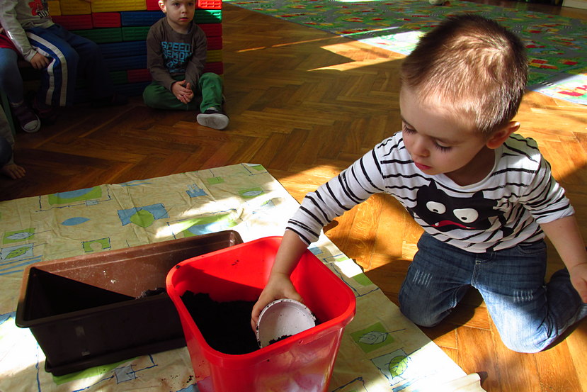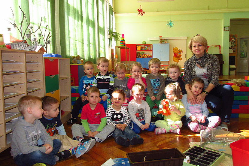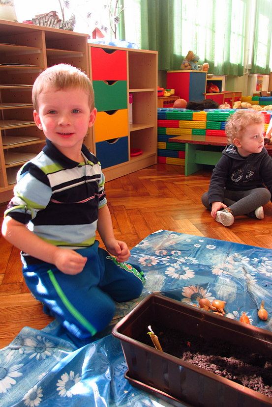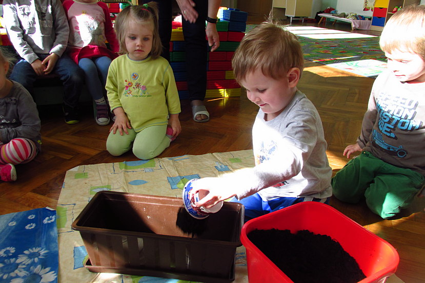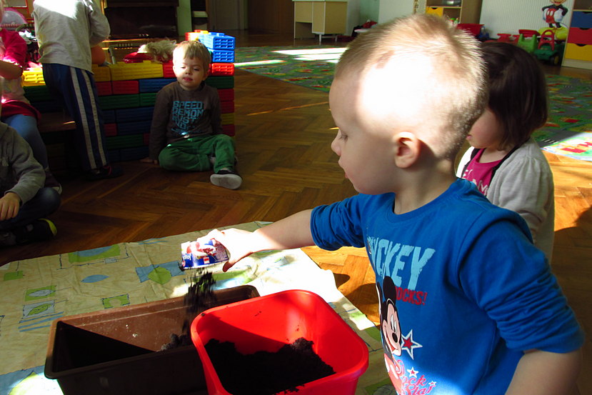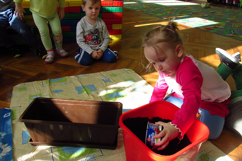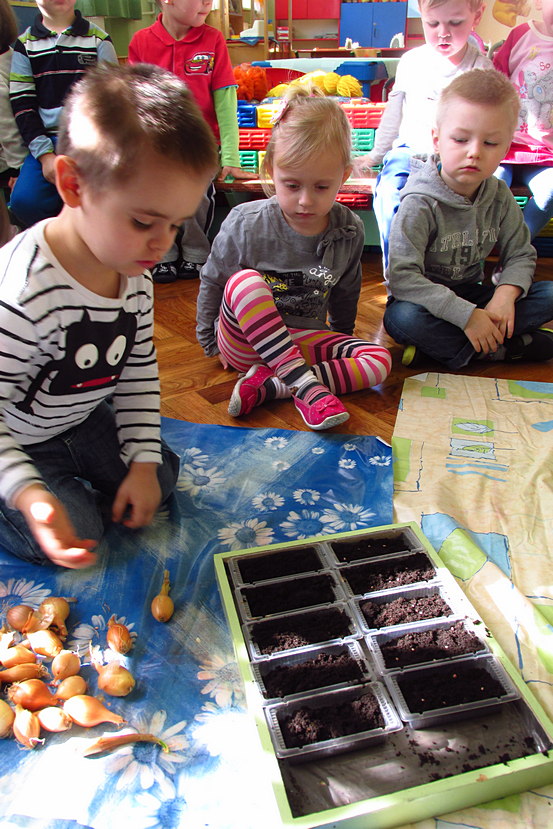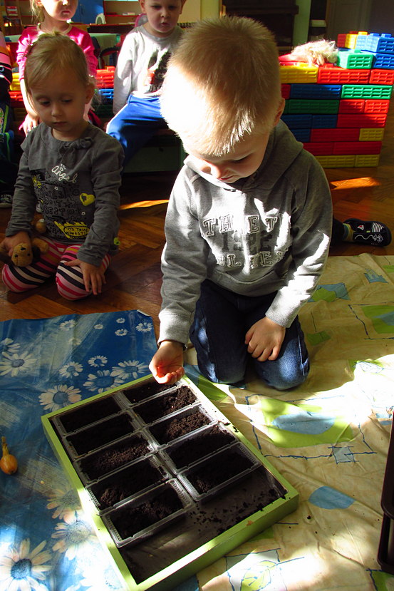 Gdy w piątek 14 marca 2014 roku Smyki weszły do swojej sali okazało się, że czeka na nich worek z ziemią, doniczki, cebulki i nasionka. Jakaż była radość dzieci, gdy pani powiedziała, że dziś same zasadzą swoją własną cebulkę i zasieją rzodkiewkę oraz astry. Po śniadaniu wszyscy zabrali się do pracy – trzeba było napełnić doniczki ziemią, posadzić wszystkie rośliny i podlać je wodą. Na efekty trzeba będzie trochę poczekać, ale mamy nadzieję, że dzięki trosce, jaką dzieci otaczają swój mały ogródek w doniczkach wyrosną piękne rośliny.