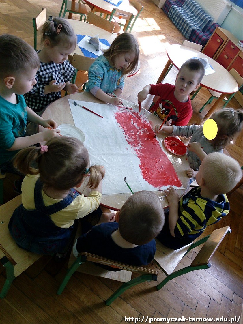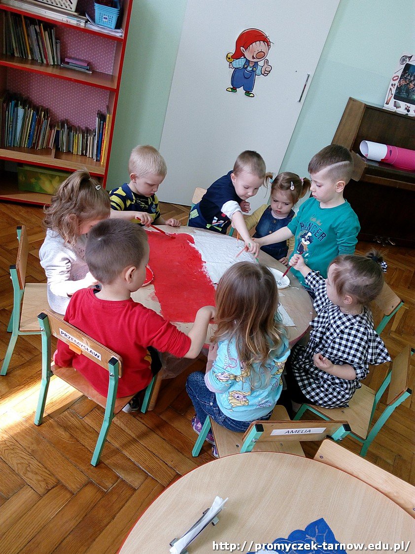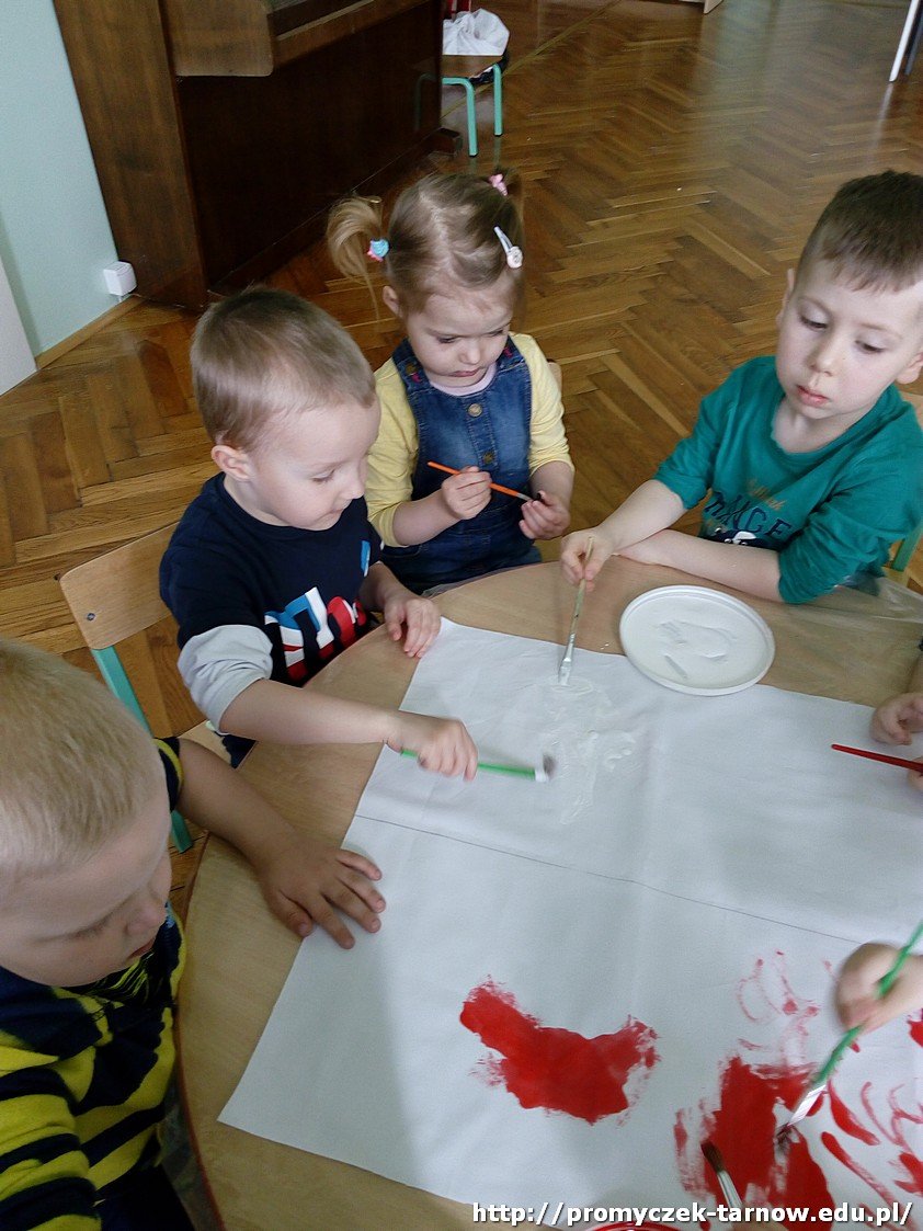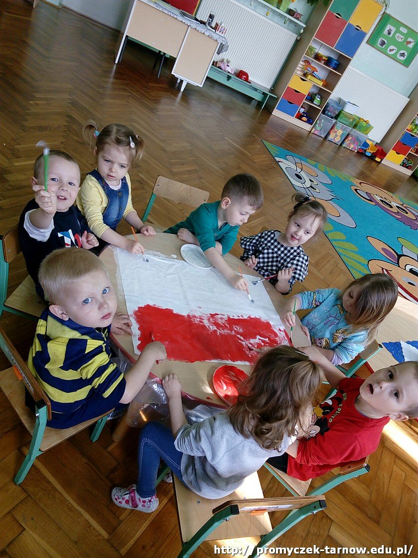 Pomimo, że pierwszy tydzień maja był niedługi, to z sali Smyków dało się odczuć zew patriotyzmu. Najmłodsze dzieci poznawały bowiem symbole narodowe, śpiewały pierwsze wesry Hymnu, a co więcej samodzielnie wykonały piękną flagę Polski na płótnie z użyciem farb.