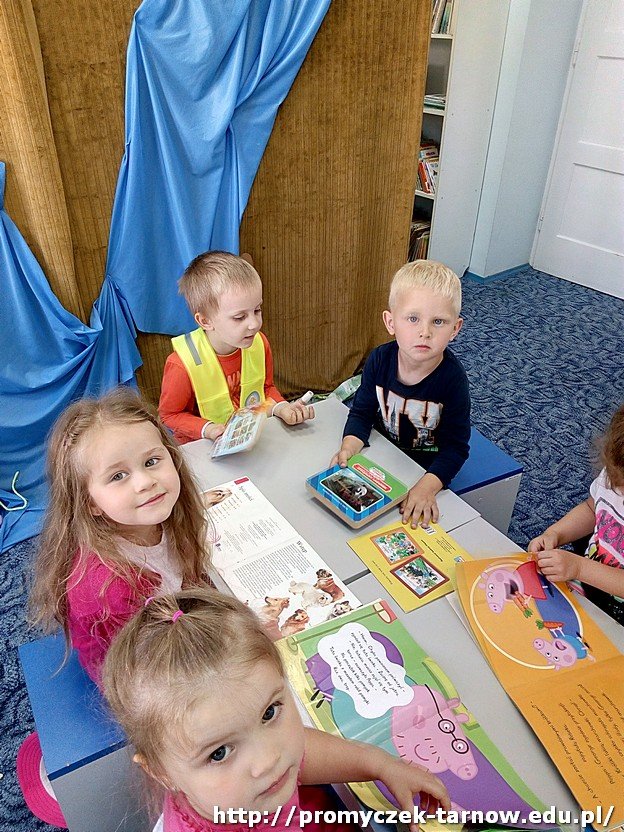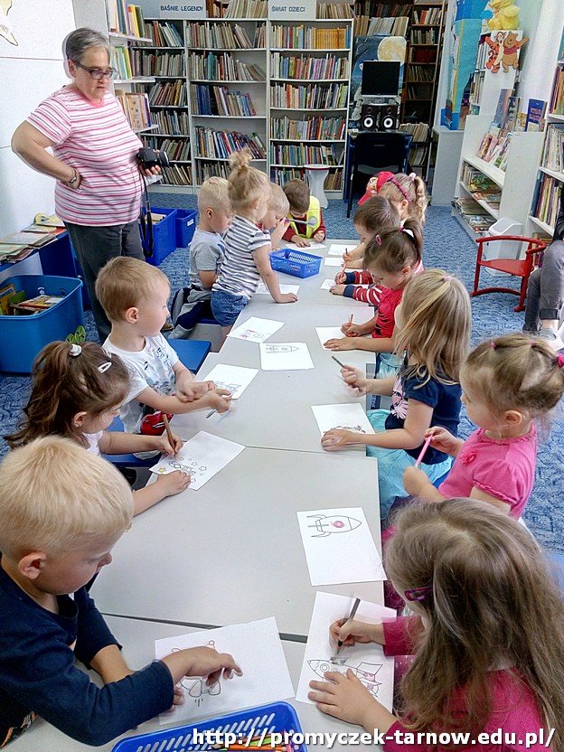 Smyki zapoznały się z rodzajami pomieszczeń w bbliotece a ponadto ogądały czasopisma i podziwiały wielość książek, a także doskonaiły swój warsztat uzdolnień poprzez wykonanie kolorowanek. Smyki wiedziały jak należy zachować się w tak specyficznym miejscu i przez całe spotkanie dumnie reprezentowały nasze przedszkole.