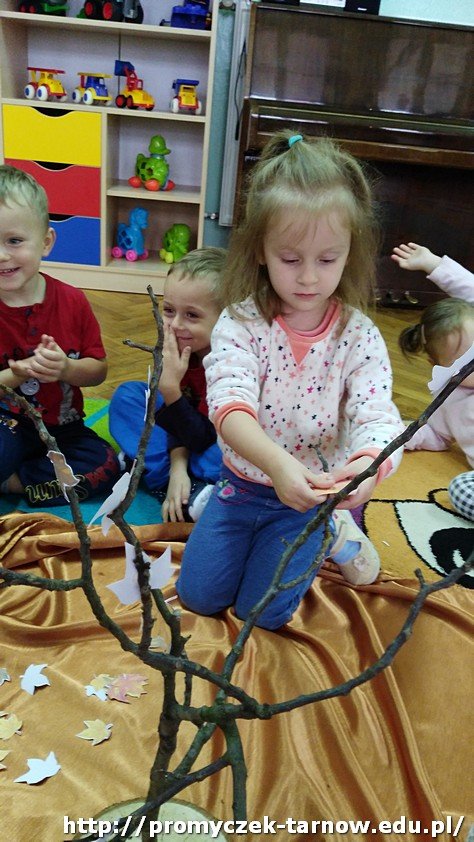 Jak się okazało była to paczka od samej Pani Jesieni, a w niej niezwykłe dary. Oprócz listu i smakowitych owoców, których dzieci mogły skosztować, znalazło się w niej bardzo smutne drzewko, które dzięki naszym maluchom uzyskało piękne jesienne liście.