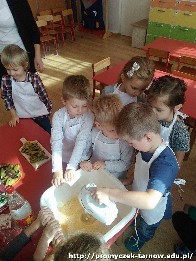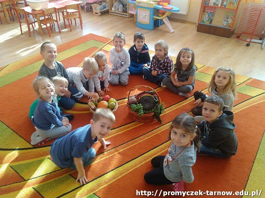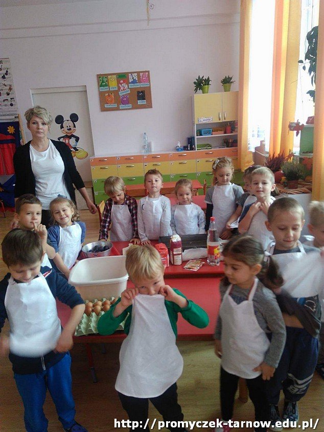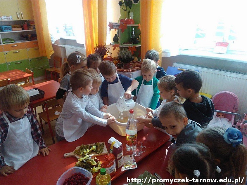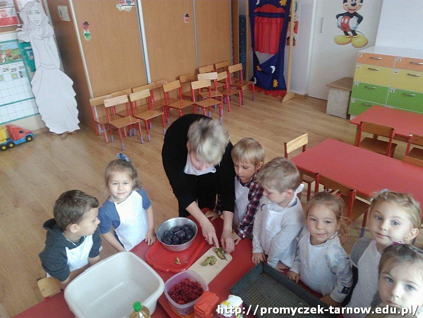Asy, tak samo jak pozostałe grupy starały się przywitac Panią Jesień w ciekawy sposób. Oczywiście nie obyło się bez ogladania darów Jesieni przyniesionych przez Panią w koszach i spaceru w poszukiwaniu oznak nowo zaczętej pory roku. Jednak najważniejszym punktem programu było "Ciasto Pani Jesieni", czyli smakołyk z owocami jesiennymi (maliny i śliwki) samodzielnie przyrządzony przez przedszkolaki.