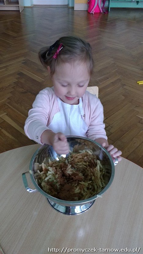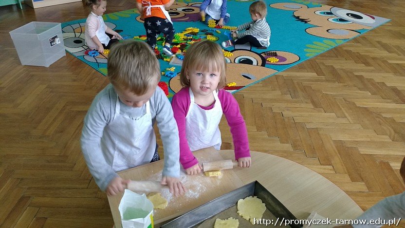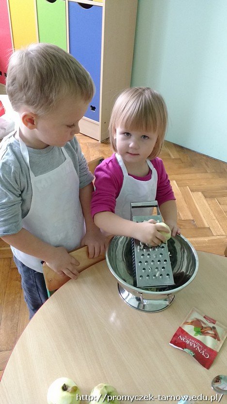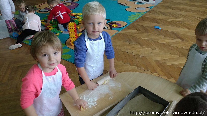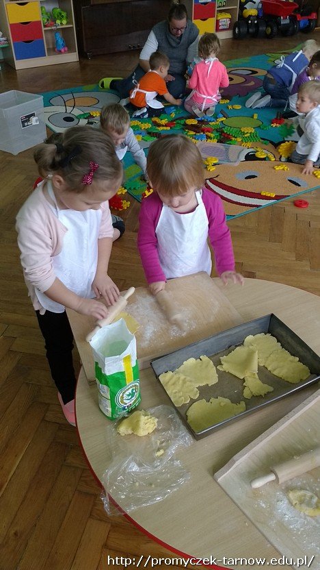 Jak widomo ważna jest dobra organizacja pracy, dlatego wszyscy pracowali w parach. Kiedy jedna para działała przy stole – reszta budowała z klocków na dywanie. Dzieci ochoto wałkowały, zalepiały formę i z pomocą pani tarły jabłka. Gdy zmęczone i zadowolone Smyki udały się na drzemkę, szarlotka wylądowała w piekarniku.