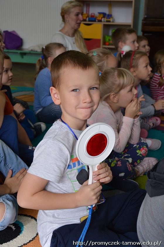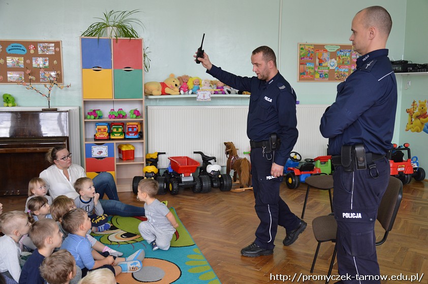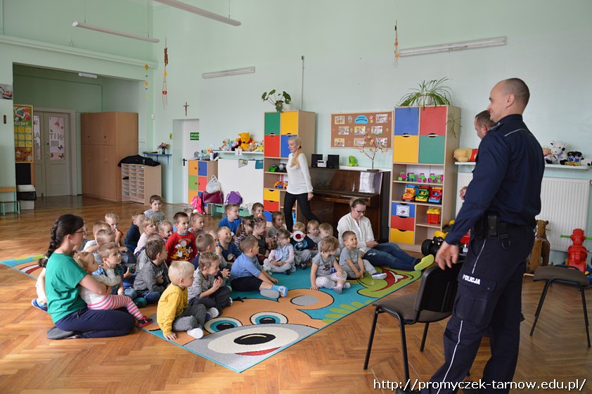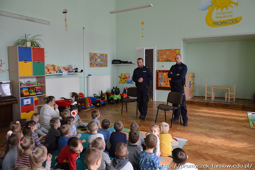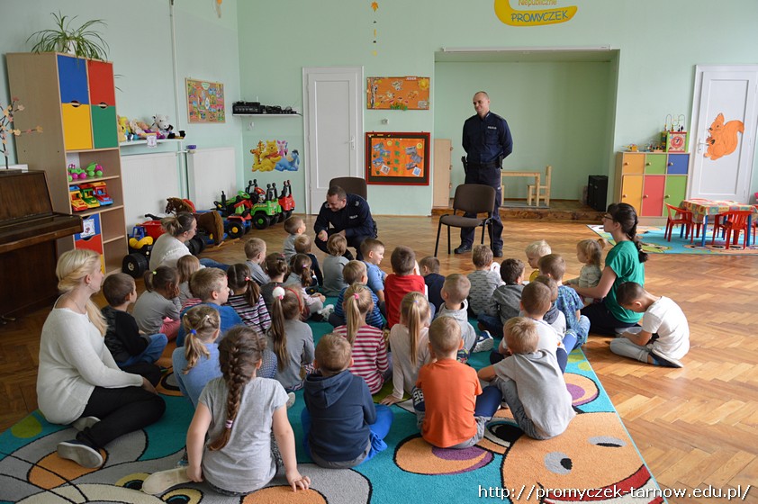 Jednym z priorytetów pracowników Promyczka jest dbanie o bezpieczeństwo. W ciągu roku realizujemy szereg działań, które mają wyczulić dzieci na kwestie z nim związane, dlatego też tradycją stały się coroczne spotkania dzieci z policjantem. Pierwsze z nich w bieżącym roku szkolnym miało miejsce we środę 4 października 2017.