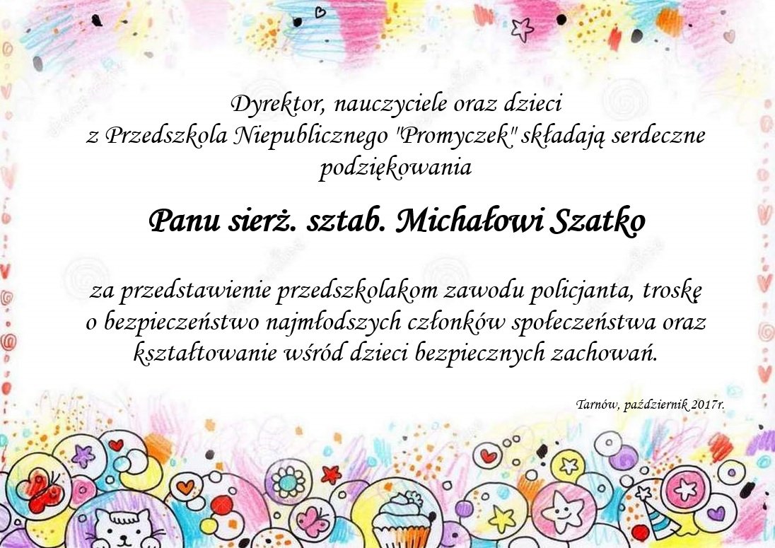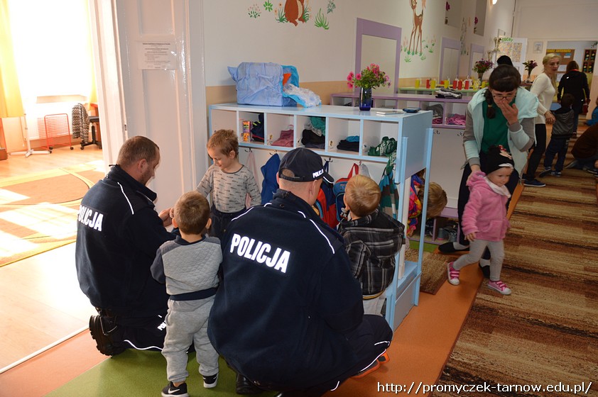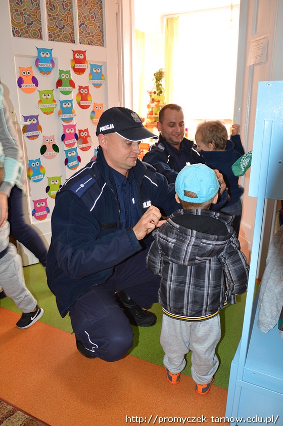 Była to znakomita okazja do poznania naszego nowego pana dzielnicowego - sierż. sztab. Michała Szatko, który okazał się niezwykle przyjazny, otwarty i z pełnym profesjonalizmem podszedł do swoich zadań (nawet do pomocy przy przebieraniu najmłodszych przedszkolaków, do czego zgłosił się ze swoim kolegą).