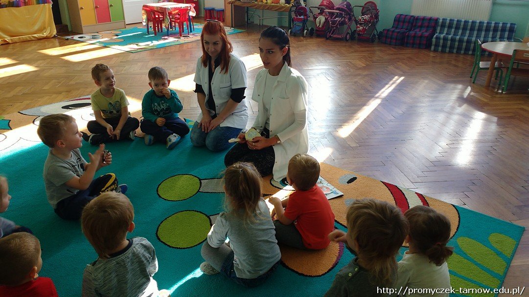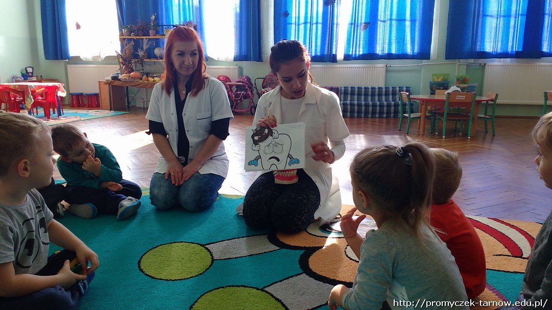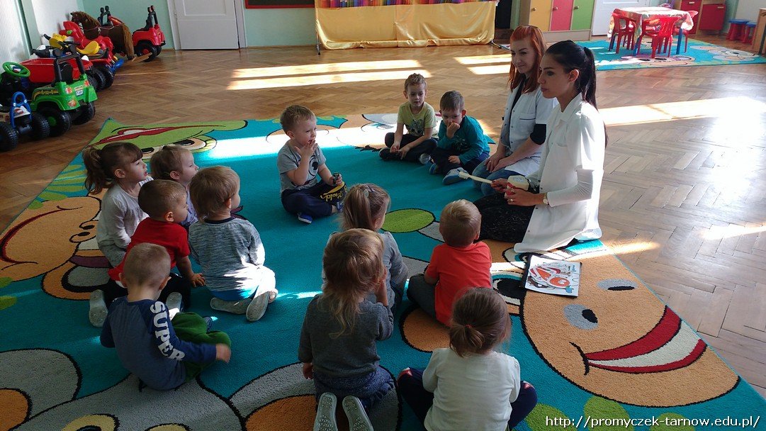 W ramach profilaktyki jamy ustnej nasze przedszkole uczestniczy w spotkaniach ze stomatologiem. Pierwszą grupą, do której zawitała pani dentystka były Smyki.