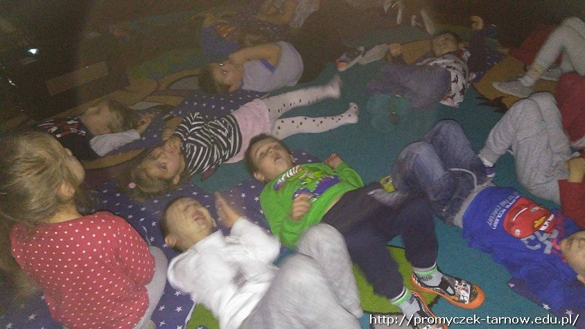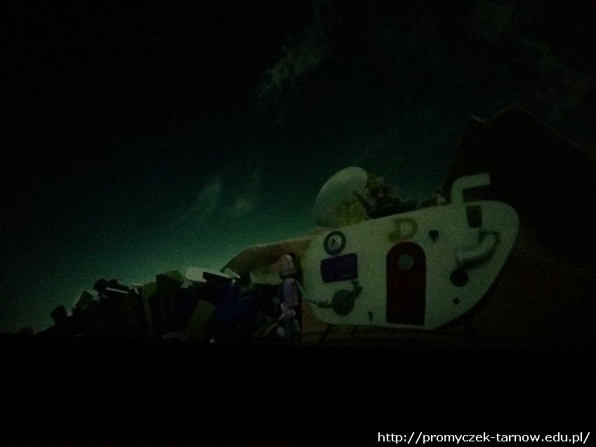 Wreszcie seans się rozpoczął! Każda grupa wchodziła kolejno do środka wielkiego balonu, gdzie na Promyczki czekały pokazy filmów o układzie słonecznym. Dzieci obejrzały bajkę uwrażliwiającą na konieczność właściwego składowania odpadów, ale także zajrzały na stację kosmiczną, która krąży po orbicie Ziemi. Wszystko to widziały leżąc wygodnie na poduszkach.