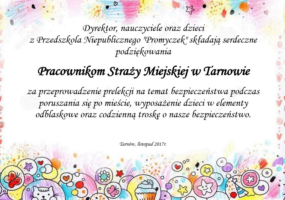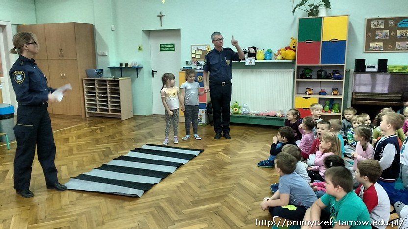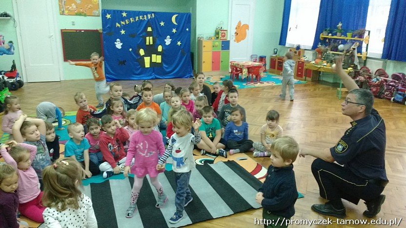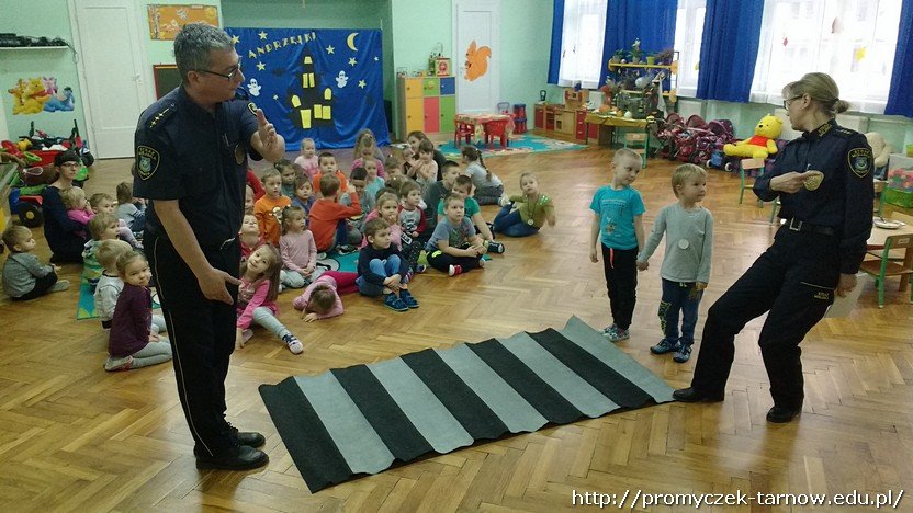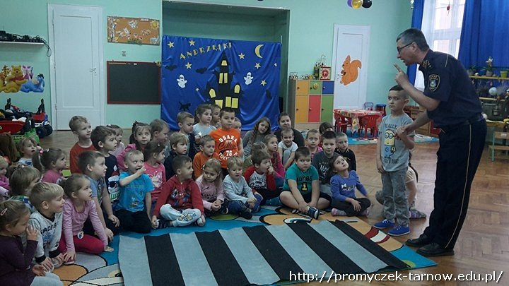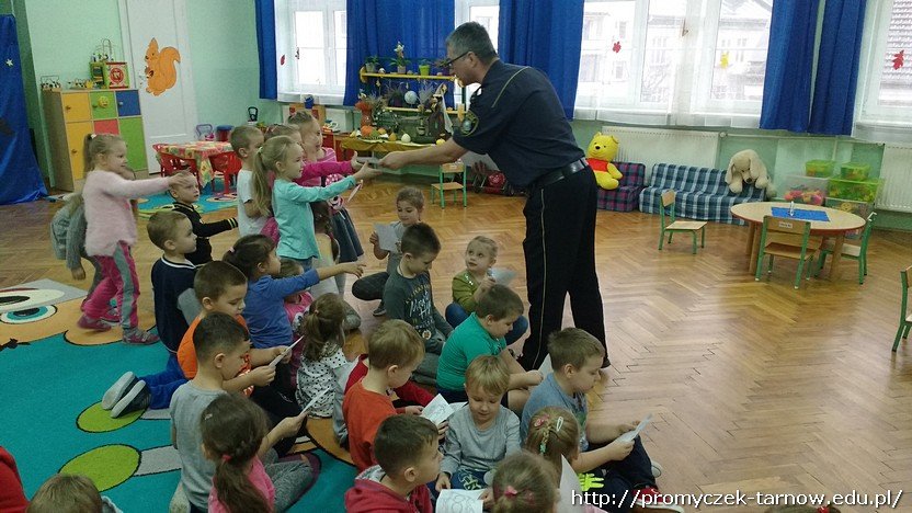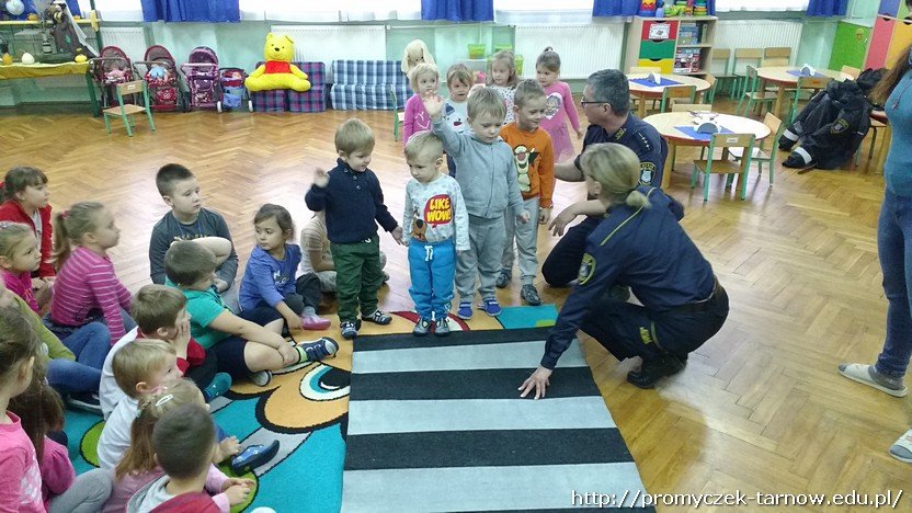 Ostatniego dnia listopada nasze przedszkole odwiedzili bardzo mili goście. Byli to pracownicy tarnowskiej Straży Miejskiej, którzy przybyli do nas z prelekcją na temat bezpieczeństwa.