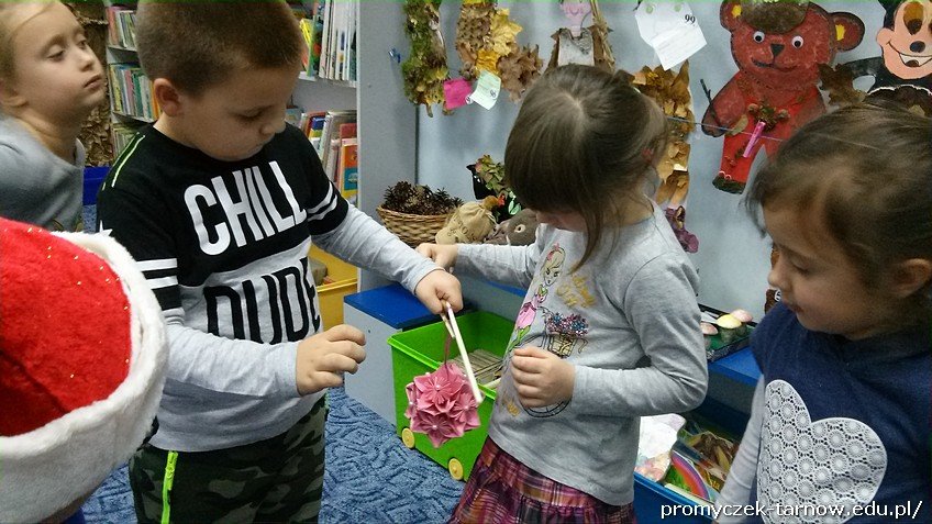 Zuchy wcielały się nie tylko w renifery, ale też w pomocników Mikołaja roznoszących prezenty. Na koniec Promyczki wspólnie (pamiętając o zasadach zgodnej współpracy i zwrotach grzecznościowych! ) wykonały świąteczny łańcuch, który wkrótce będzie ozdabiał Biblioteczną choinkę. Zapraszamy do podziwiania!
