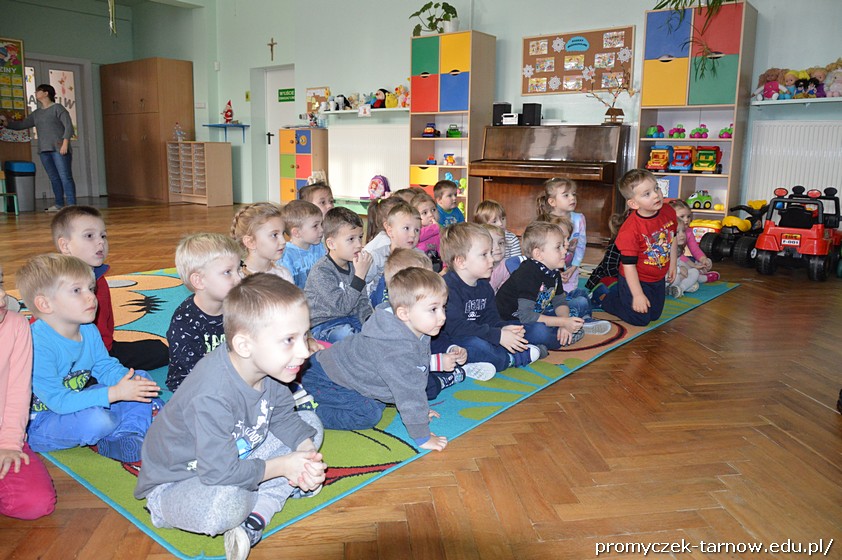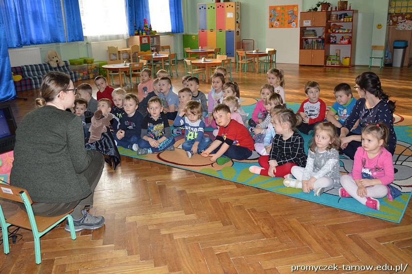 Przedszkolaki z uwagą słuchały referatu i chętnie odpowiadały na pytania. Wiedza niektórych dzieci zaskoczyła nawet panią prowadzącą! Na zakończenie spotkania każdy dostał pamiątkową naklejkę.