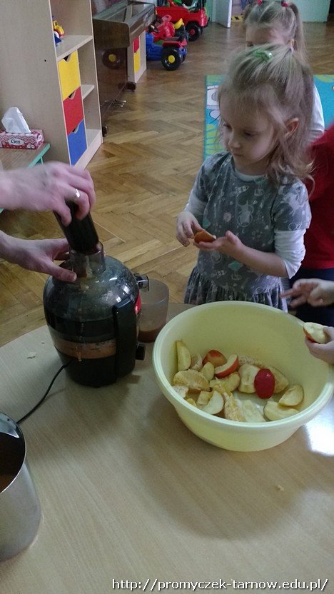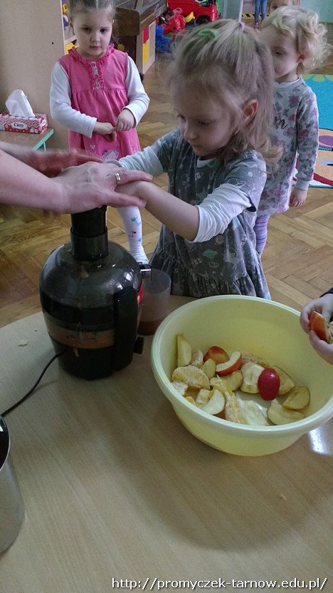 Smyki wrzucały czyste i pokrojone owoce do sokowirówki, ze zdumieniem obserwując ile pysznego soku powstaje z danej porcji. Efekt tych działań był niezwykle smaczny, o czym wszyscy przekonali się przy obiedzie – wtedy właśnie Smyki spróbowały swojego wyrobu.