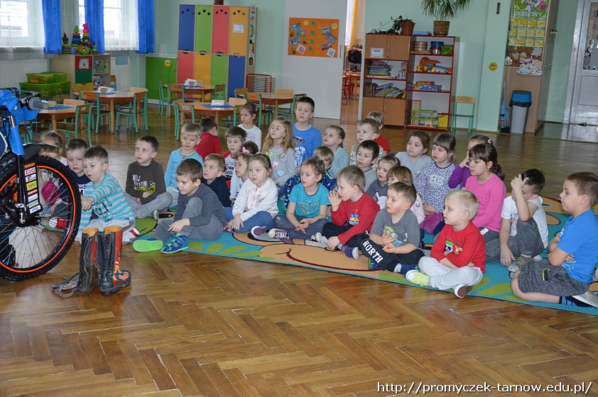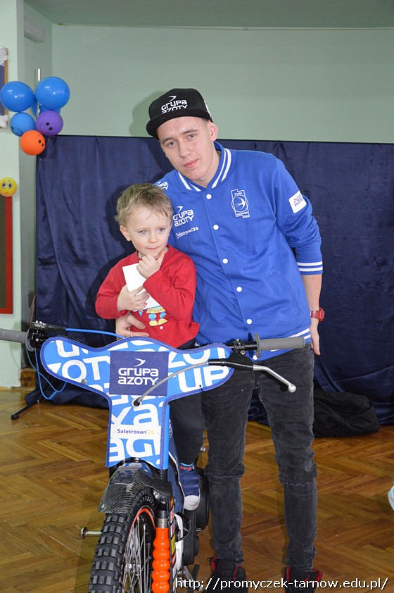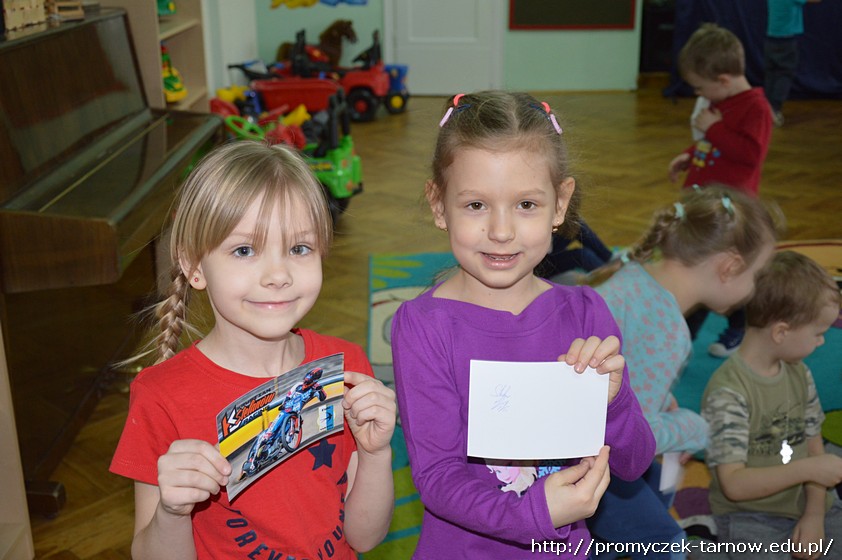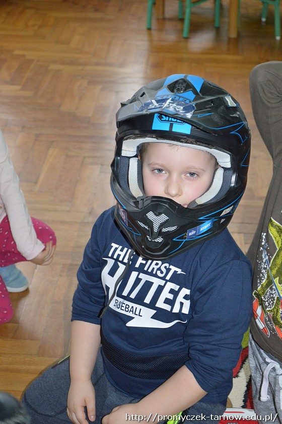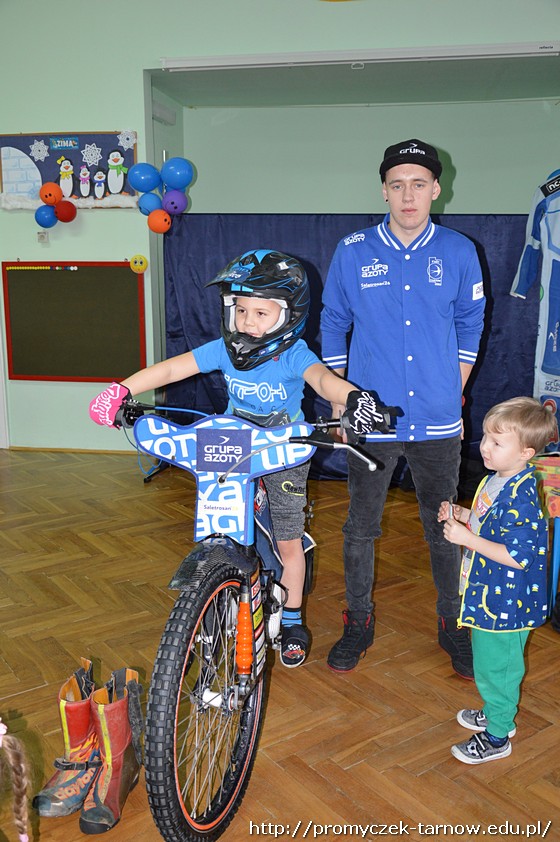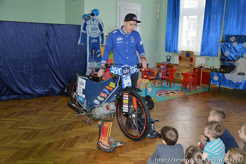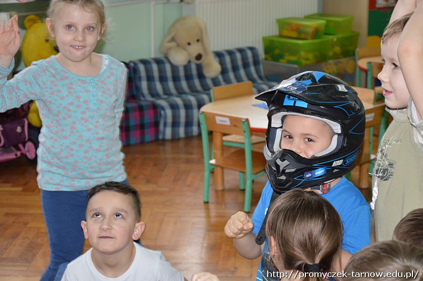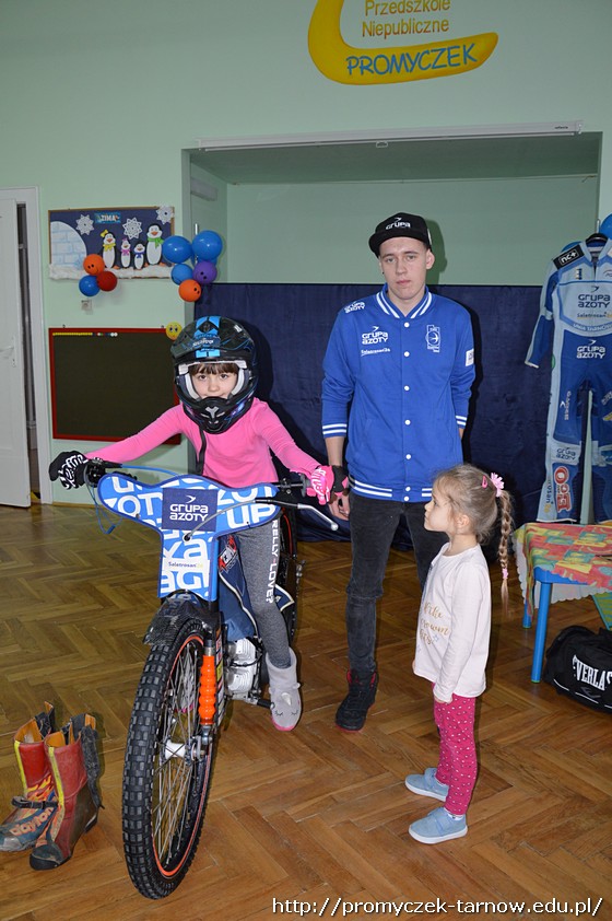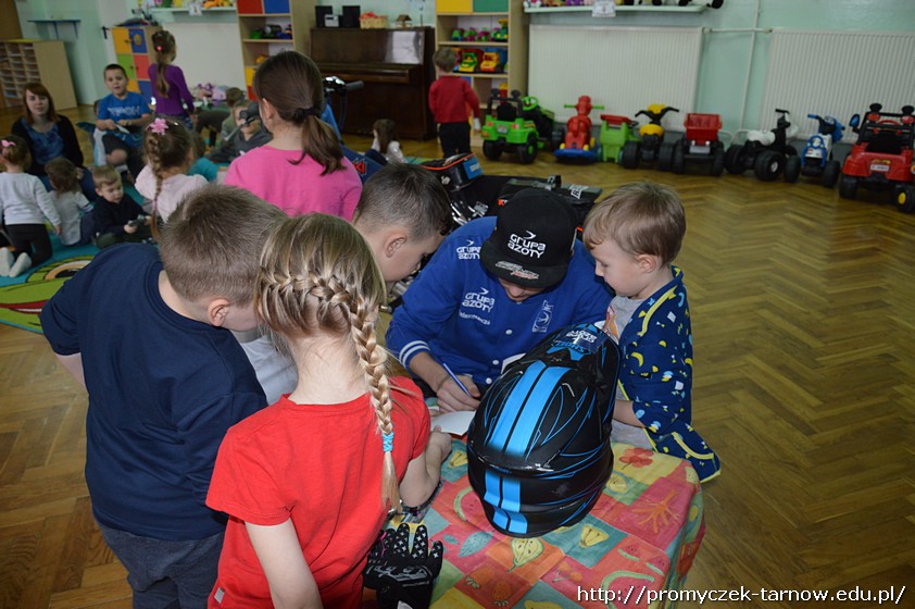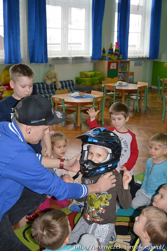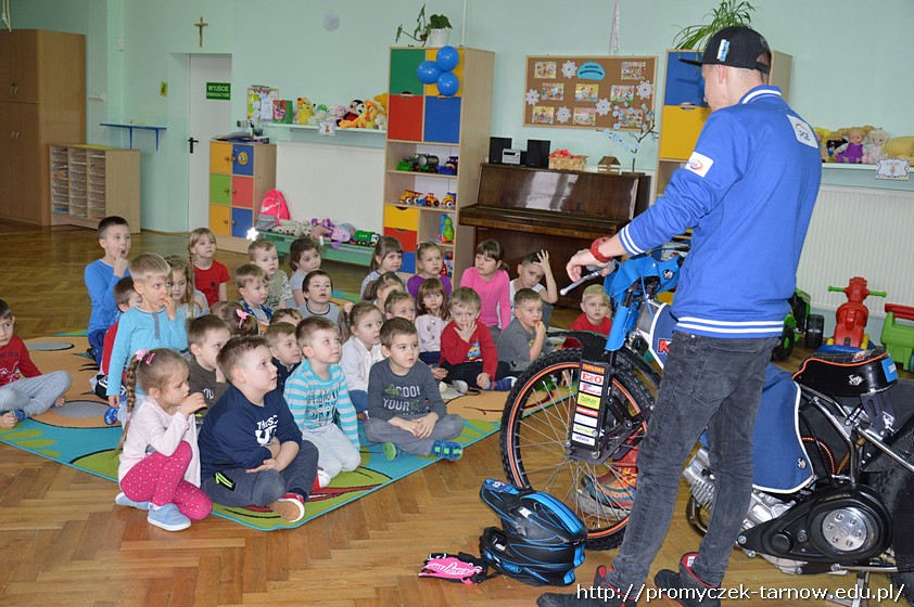 Nasze przedszkolaki były zachwycone spotkaniem! Z wielką radością słuchały wypowiedzi Krystiana na temat sportu, który uprawia, oglądały motor, przymierzały kask i rękawice. Co odważniejsi mogli nawet usiąść na motorze!