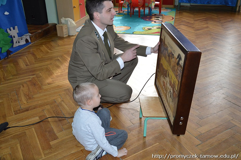 Wiosna to czas w którym wiele zwierząt budzi się z zimowego snu. Ostatnie spotkanie z leśniczym pomogło Promyczkom zapoznać się ze zwierzętami żyjącymi w lesie, z ich nawykami żywieniowymi, a ponadto, dzięki specjalnej tablicy, dzieci mogły również posłuchać odgłosów jakie wydają dzikie zwierzęta.