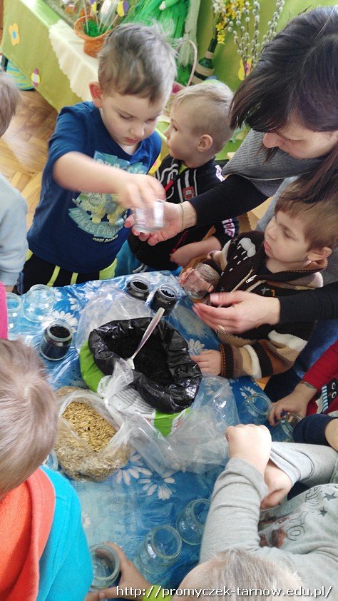 Natomiast cieplejsze już środowe przedpołudnie upłynęło pod znakiem poszukiwania oznak wiosny. W tym celu dzieci wraz z paniami wybrały się nad tarnowski Wątok. Dostrzeżono kaczki oraz gołębie, które chętnie pozowały do zdjęć wraz z dziećmi. Kolejno, w ogrodzie podziwiano piękno budzących się z zimowego snu roślin. Promyczki miały także w tym dniu okazję poczuć się jak ogrodnicy, siejąc do specjalnych słoiczków owies celem wzbogacenia kącika przyrody.