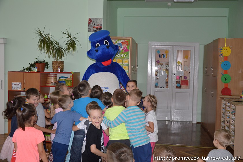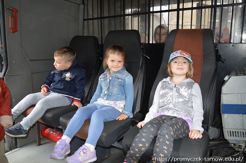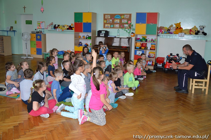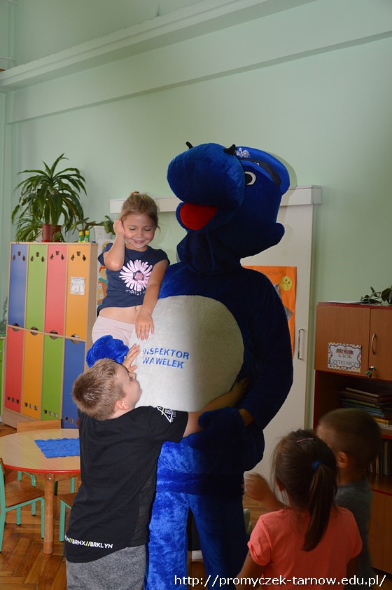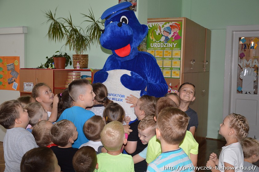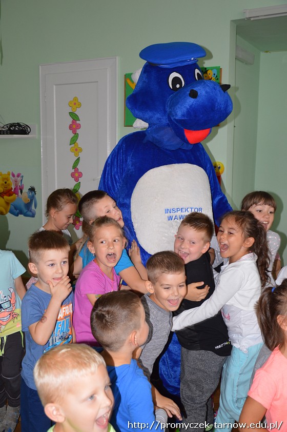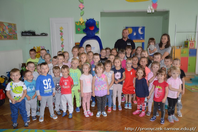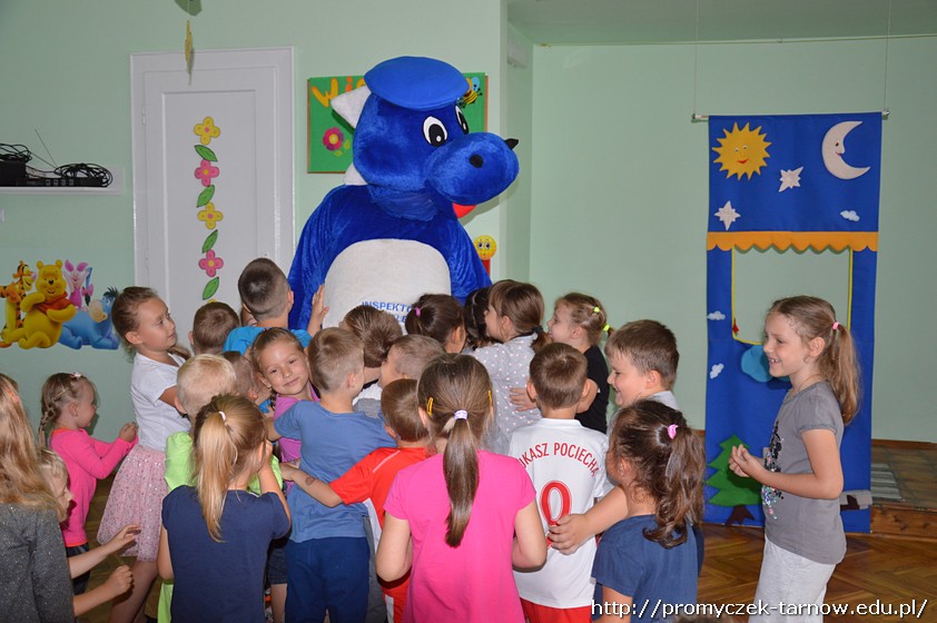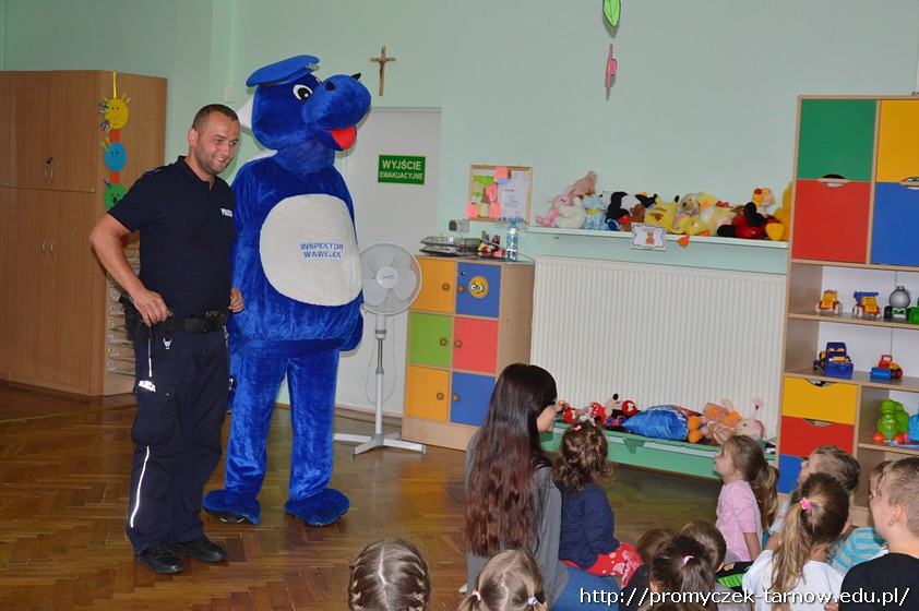 Duża już ilość wiedzy w tym zakresie jaka posiadały dzieci została uzupełniona praktycznymi radami i wskazówkami fachowca. Dodatkową atrakcją w czasie wizyty okazało się przyjście Inspektora Wawelka, który także zapoznawał dzieci z zasadami bezpieczeństwa.