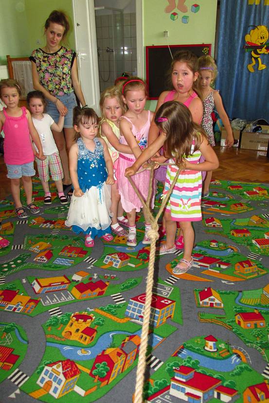 Nasz nowy znajomy przygotował wiele atrakcji - tańce, zabawy ruchowe, konkurs piosenki, a nawet przeciąganie liny! Atmosferę umilały kolorowe bańki, które przez cały czas produkowała specjalna maszynka.