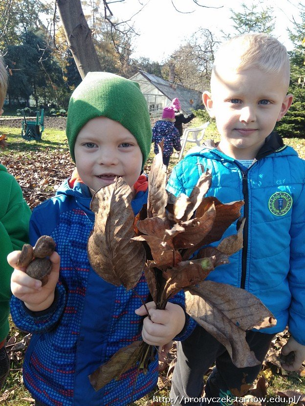 Dzieci mogą skorzystać z ogrodowych sprzętów, biegać, skakać, grać w piłkę, jednak najlepszą zabawą okazuje się być zbieranie jesiennych skarbów oraz zabawy kolorowymi listkami. Cieszymy się, że codziennie możemy obserwować zmieniającą się przyrodę.