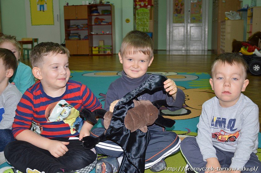 Na podstawie prezentacji multimedialnej i opowiadań panów z ZPKWM dzieci poznały odpowiedź na pytanie postawione w temacie spotkania. Przy okazji poznały wiele nieznanych dotąd gatunków zwierząt i ciekawostek na ich temat. Dodatkowo mogły pobawić się pacynkami zwierząt przyniesionych na te zajęcia edukacyjne np. nietoperzem, wiewiórką i żabą.