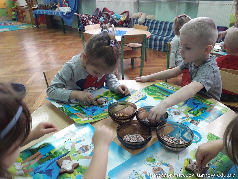 Grupa Smyki z zaangażowaniem przygotowywuje się do nadejścia Świąt Bożego Narodzenia. Przedszkolaki z olbrzymią chęcią ozdobiły pierniczki lukrem i posypały posypką.