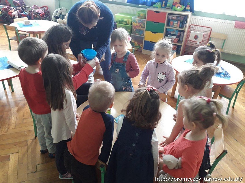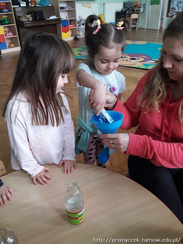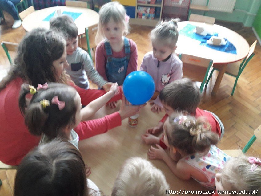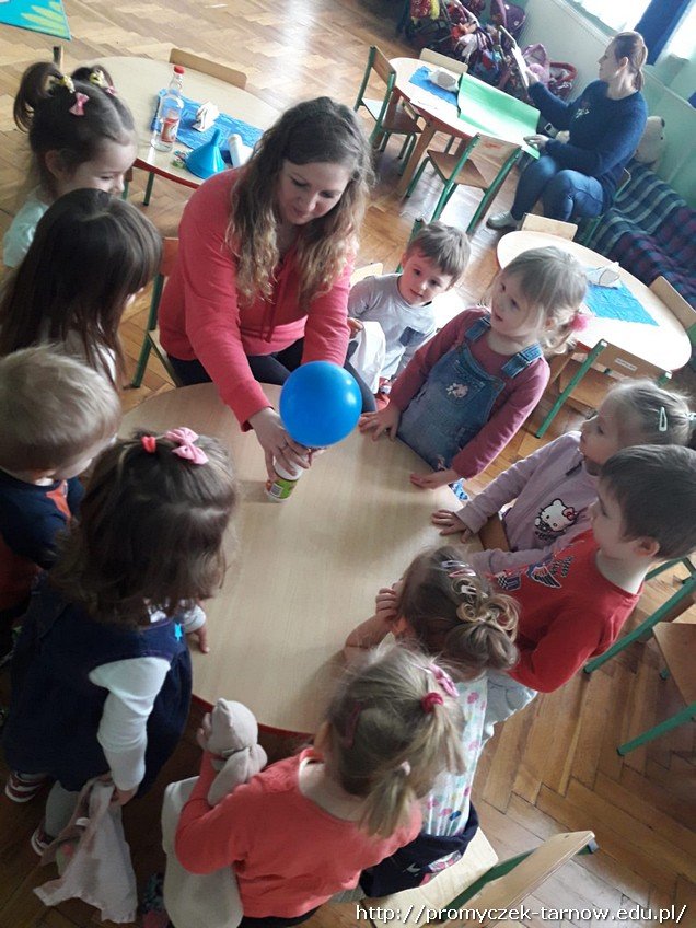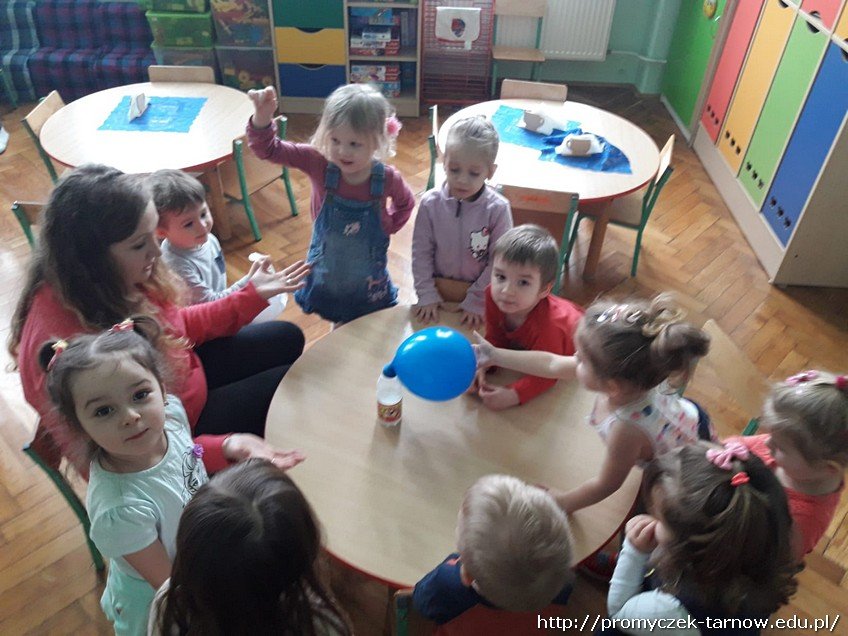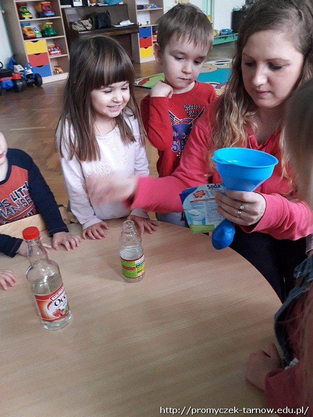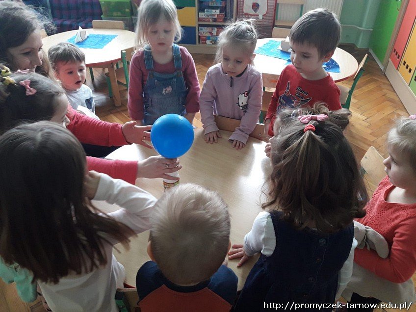 Dni w sali w grupie Smyki mijają w sposób bardzo owocny. Jednego przedpołudnia dzieci same się przekonały, że balonik można napompować nie tylko ustami, czy pompką, ale za pomocą eksperymentu. Dowiedzieli się że gdy się połączy sodę z octem to balonik uniesie się w powietrze.