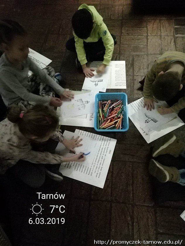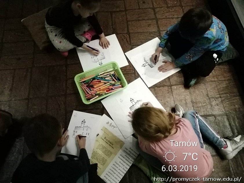 Podczas spotkania poznały historię naszego miasta, jego założycieli oraz wiele ciekawostek związanych z powstaniem Tarnowa. Dzieci były bardzo zaskoczone jego odmiennym wyglądem w dawnych czasach i ciężko było sobie im wyobrazić te zmiany. Jednak zdjęcia zaprezentowane przez naszą przemiłą przewodniczkę po dawnym Tarnowie musiały ich przekonać. Dodatkową atrakcją spotkania było kolorowanie herbu Tarnowa oraz ratusza, w którym akurat przebywały.